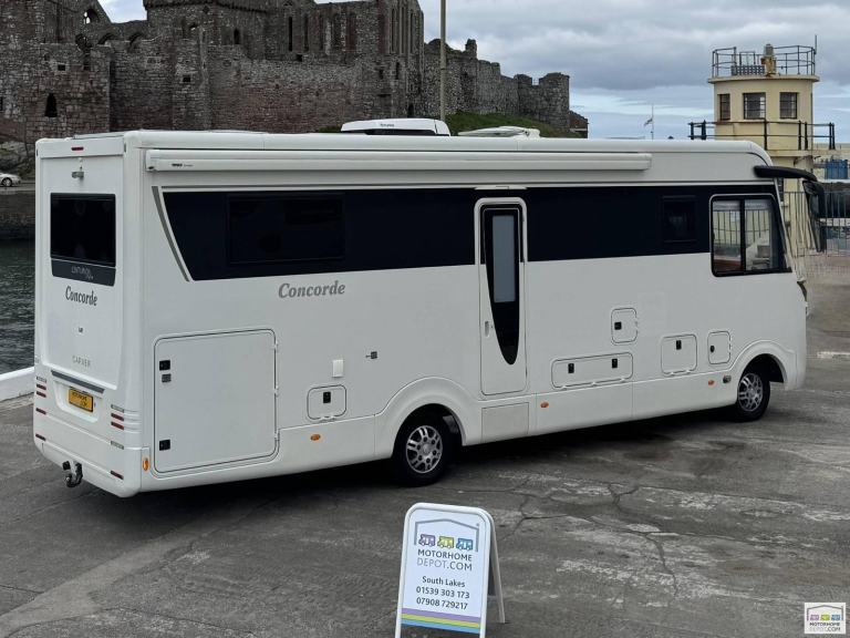2017 Concorde Carver 890 RRL Ultra-Luxury A-ClassThe pinnacle of German engineering built on the robust Iveco Daily 3.0L chassis (7490kg), this high-end "Centurion Style" finish has only 8,000 miles is ready for immediate luxury touring. Automatic, Left-hand drive.Rear U-Shaped Lounge (RRL)Berths: 4 / Seatbelts: 4Dimensions: 9.1m Length / 7.49t WeightAir Suspension & E&P Hydraulic LevellingLuxury Living & SleepingRear Lounge: Huge transverse U-shaped lounge with 3-sided Venetian blinds and satellite TV. Converts to spacious double.Front Bed: Electrically lowered double bed over the cab for easy transitions.Climate: Alde wet central heating with 3-zone underfloor heating for true 4-season comfort.Bathroom: Massive open-plan washroom with porcelain SOG toilet, large shower, and "Marble White" vanity.Premium Kitchen & StorageGalley: Seamless mineral worktops, 3-burner gas hob, oven/grill, and large Dometic fridge/freezer.Garage: Extra-large rear garage with dual access doors, perfect for bikes and gear.Exterior: Large awning, external BBQ point, and external shower in the garage.Tech & SafetyDriving: Touchscreen Nav, Reverse Camera, Cruise Control, and heated wide-angle mirrors.Power: 2 x Solar Panels for off-grid freedom.Security: Key-code touch pad entry, full Alarm system, and Habitation Gas Detector.Extras: Tow bar, stainless steel wheel covers, and removable leather steering wheel.