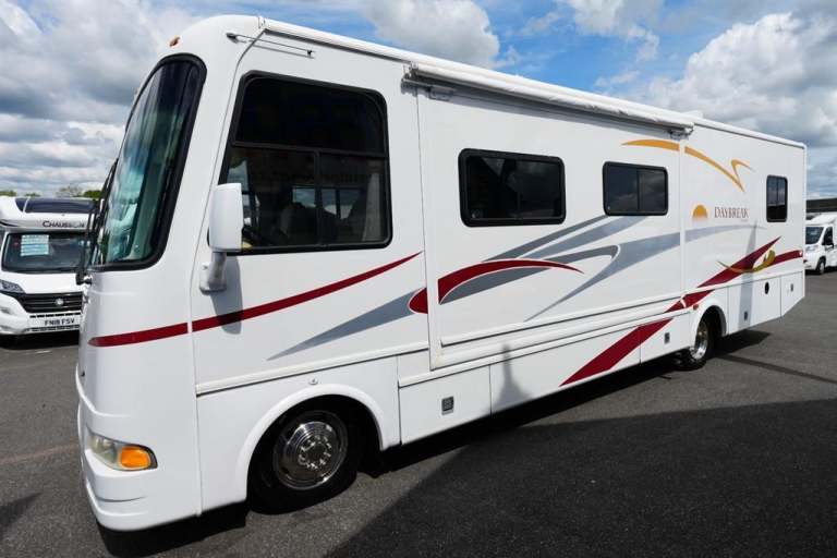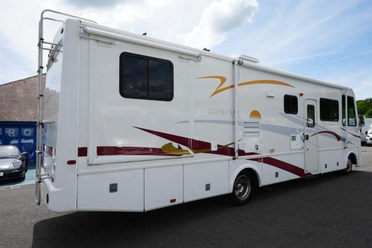 7490 KG Gross weight C1 driving licence required...L-10.2m...W-2.56m...H-3.60m.. Perhaps the best known LHD American RV over here in the UK. Based on the Workhorse Ford chassis, with a 8.1 litre petrol V8 engine LHD. This particular Damon Daybreak 3272 Automatic, the humongous amazing living space and substantial storage space for your personal belongings. All this from epitome of elegance 6 berth 2 travelling seats configuration. Plus having twin habitation air conditioning units on board, an absolute must if you were permanently living in it or exploring Europe. The two electrically operated slide-outs extension, encompasses the end bedroom and the dinette lounge area. A sumptuous island double bed, a perfect solution for that cosy nights sleep. With wardrobes either to hang your clothes etc. Next comes the en-suite bathroom, featuring bath shower, with perspex shower screen, toilet, hand wash basin vanity unit, beautiful hand crafted wood cabinets to house all of your toiletries and of course a large vanity mirror. Progressing forwards the central fully equipped kitchen, consisting of 3-burner gas hobs, combination oven grill, microwave, extractor fan, large tower fridge freezer, sink, generous amount of worktop space and elegant dark oak cabinets for the kitchen utensils. Directly opposite the double dinette, for eating that recently cooked delicious meal. With the family/ guest and above even more cupboards.Then when ready for bed, will seamlessly transform into another adult size double bed. Adjacent the serene atmosphere lounge, featuring Brand new luxury ergonomically sofa, a recliner chair plus and foot stall. ( PLEASE NOTE: THAT WE STILL HAVE THE ORIGINAL SOFAS INCLUDING LAP BELTS). Only an idea, by swivelling both front captain seats around. Ingeniously increases the seating capacity. Perfect for unwinding with a chilled bottle of wine. While enjoying each others company, occasionally casting your eyes out at the glorious sunshine or the picturesque starry night. When ready for a cosy nights sleep, the actual sofa effortlessly converts into a further double bed, where two people can sleep extremely comfortable. This makes up the six sleeping arrangements from this American RV Damon Daybreak 3272 Automatic. Which comes with a massive specification, such as, twin electric wind out canopy awnings/ with brand new canvases, new tyres, cab air conditioning, 2 x habitation units, satellite dome, bus lockers, self levelling jacks manual, 240 sockets, 5.0 generator, electric bus mirrors, LPG, grey/black water tanks, roof access ladder and will be supplied with all the documentation including two sets of keys. Are you ready for the ultimate recreational vehicle experience!!
