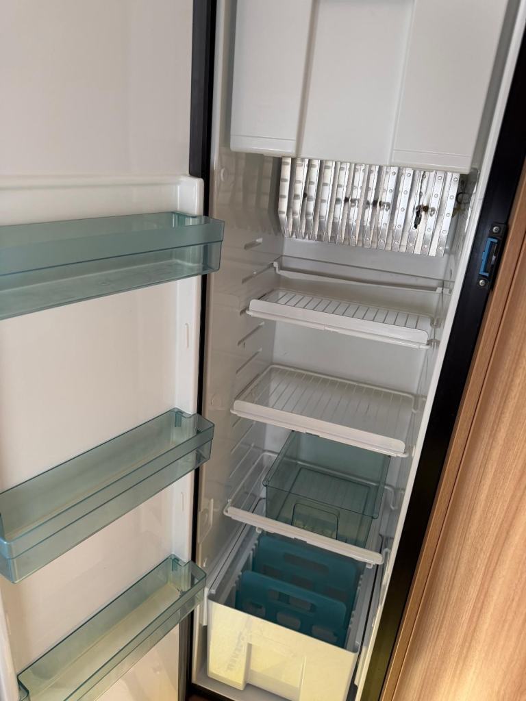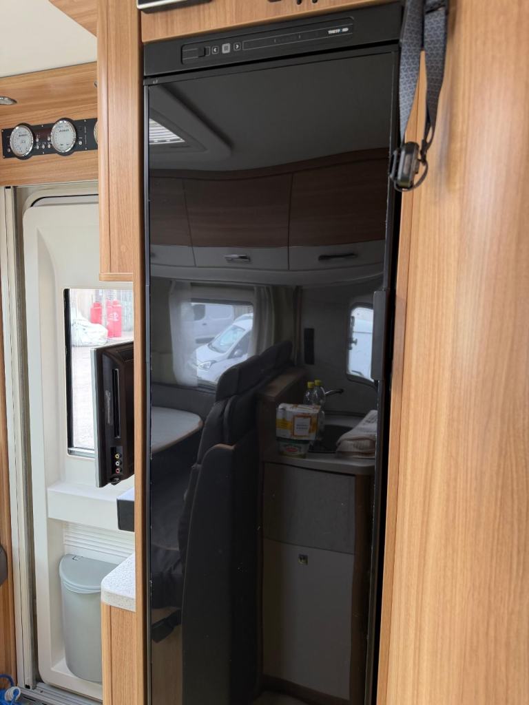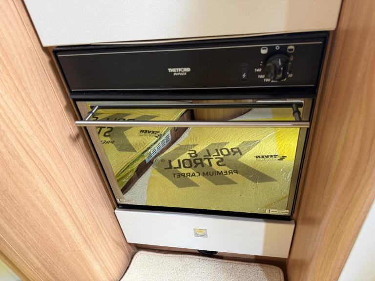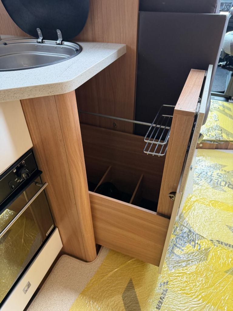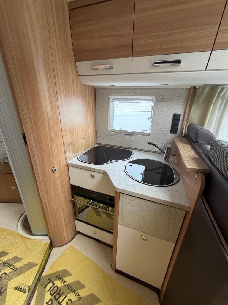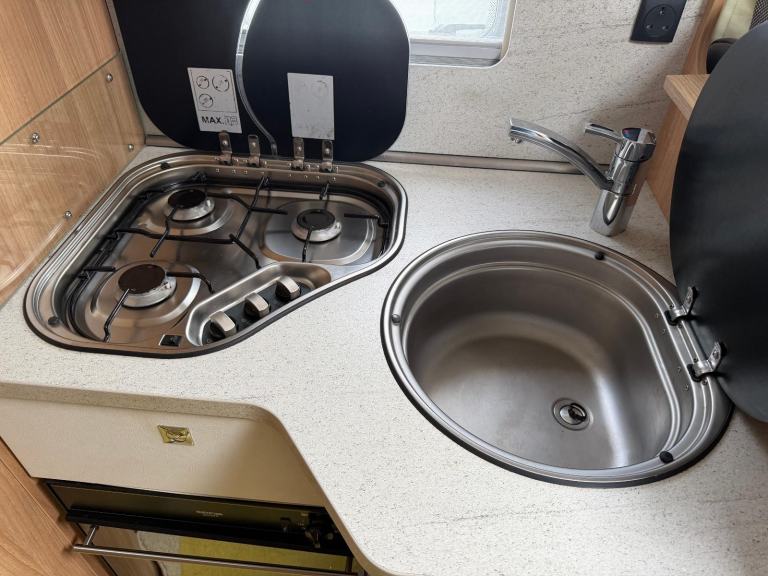 All the windows have blinds, screens and there is a lounge tv which is hooked up to the wireless satellite system this motorhome comes with. This area also converts into a single bed. In the centre of the motorhome is the kitchen consisting of a three-burner gas hob, sink, oven/grill combo and on the opposite side a large slimline three energy source Fridge/Freezer. There is plenty of storage and a pull out surface for food prep etc. LED lighting all around.