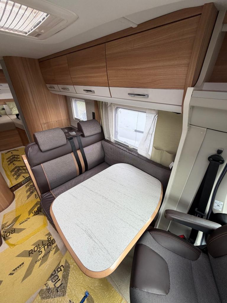 On entering the habitation area, one is immediately struck by the light and airy feel of the whole motorhome partially due to the large central rooflight. The lounge and dining area consisting of twin belted forward facing seats, twin swivelling cab seats and single seat just to the right of the door as you enter. With the swivel seats it makes a larger convivial social area for 5 people.