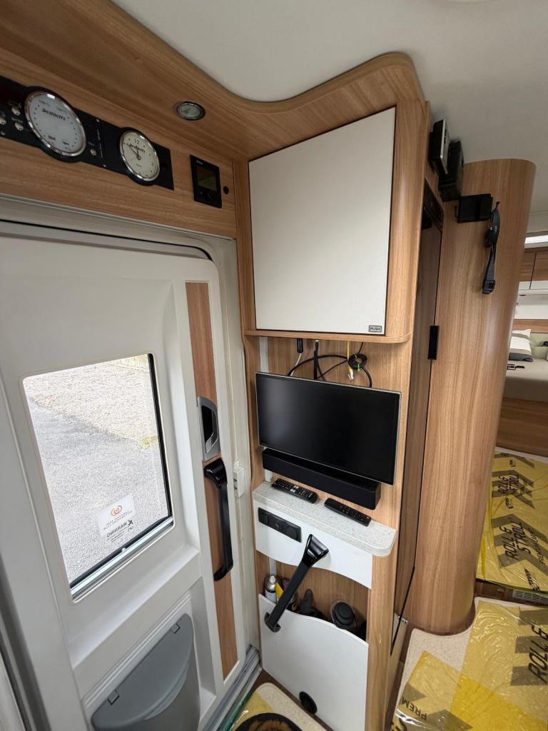 This motorhome is designed to be used off-grid with a 300 watts of solar panel, two leisure batteries, 5000w power inverter, refillable gas bottle and an outside BBQ gas point. The large garage area has full access via one metre high doors on both sides and has fittings to tie down any stowed items under the double bed above. There is also a tow bar fitted. Extra FEATURES: Air Suspension, Reversing Camera, Fiamma Canopy, 2 x TV's, & Diesel Heater.