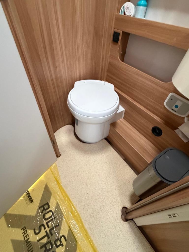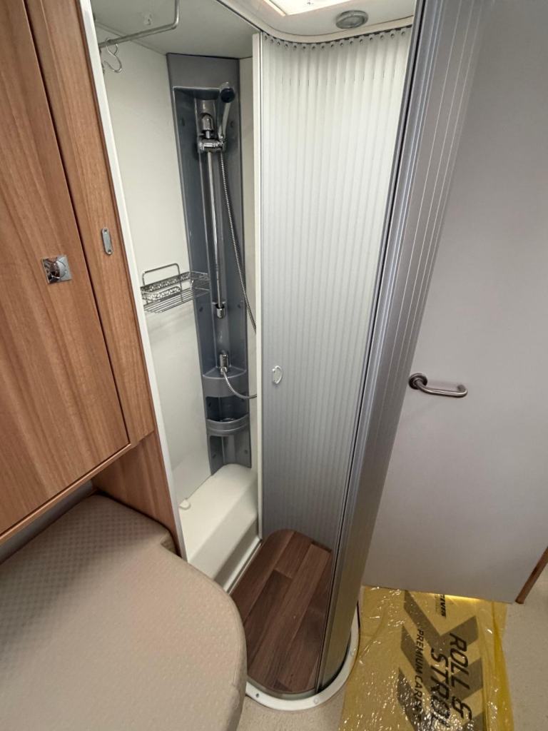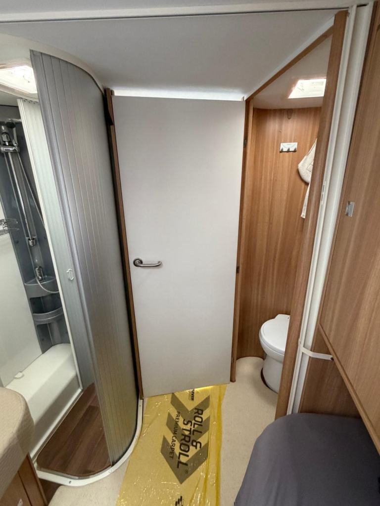 Moving to the back of the motorhome you have the split bathroom area and the bedroom which can be sealed off from the lounge/kitchen using the washroom door. There is a separate toilet and washroom on one side of the vehicle and a separate shower room on the opposite side, a great feature. There is again lots of window space giving it a great airy and light feeling. The beds are 2 singles which can also be made into an extra large double if needed. Rear TV fitted when you lay there on the bed which has ratcheted tip-up mattress supports on each side making for luxurious lounging with the Sunday papers, while on-rail reading lights match those in the lounge.