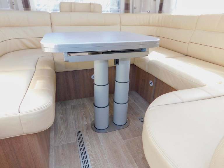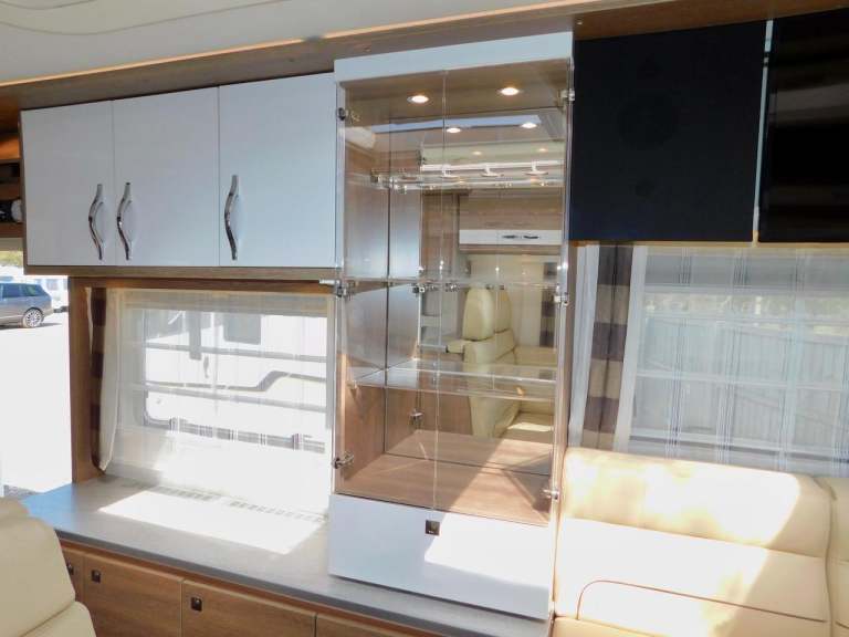 The central Hallway provides additional Workspace, lit glass storage units, and convenient storage options. Retreat to the U-shaped rear lounge, complete with an adjustable Dining table, Two Seat-Belted rear-facing seats, Plus a Very Large drop-down TV with built-in speakers, and elegant glass corner units. Beneath the seating, you’ll find hidden storage to keep your space clutter-free.