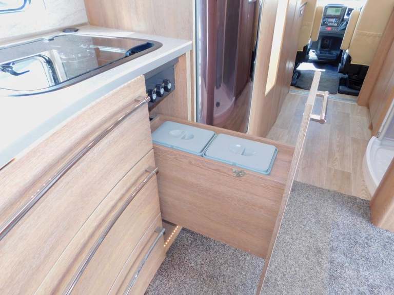 Cooking on the road has never been easier! The Beautiful spacious and Open feeling Luxury Curved kitchen boasts a 3 x Burner Gas Hob, Stainless Steel round Sink with Electric Mixer Tap, as well as a Very Large Automatic Energy Selection 3-way Fridge with a Separate Freezer. We also get an Oven and a Grill. With electric door and drawer locks and an Exceptionally Large Storage. This is perfect for creating culinary masterpieces, or the plainest of cooking wherever you go.