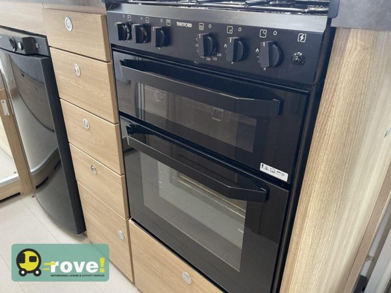 Opposite the washroom sits the well-equipped central kitchen, thoughtfully designed to make cooking on the road simple and enjoyable. Featuring a multi-burner gas hob & electric hot plate, oven and grill, Microwave, sink, fridge with freezer compartment and useful worktop space, the kitchen provides everything required for preparing meals during short trips or extended touring adventures.