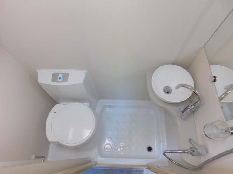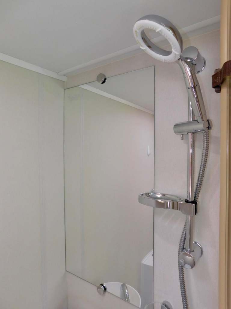 The spacious SHOWER Room has a water saving Shower Head, Flushing TOILET with thetford cassette, and a Wash Basin with an Electric Tap.