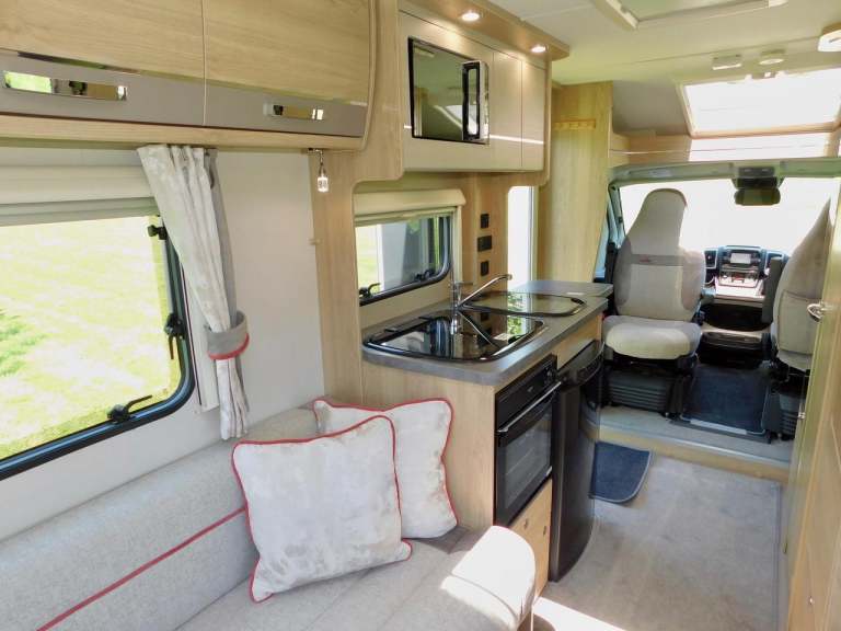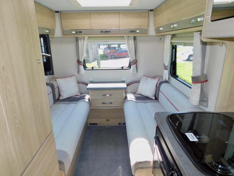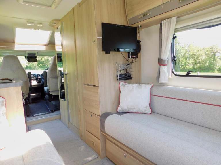 We have that TARDIS Like Interior that belies its overall length of 5.99m with its Super Spacious REAR LOUNGE that you can either Sleep on as 2 x Large Single beds or a Huge 4’ 7” x 6’ 7” Double Bed…. The Rear Lounge also has a Seating Insert to make it into a U Shape Rear Lounge just by removing the small drawer unit. A Dining Table with folding legs fits into this area and easily stores away in the spacious Wardrobe. There are a plethora of Storage Lockers throughout this Motorhome. There is also a wall mounted LED TV and a roof mounted TV Aerial, as well as all the sockets needed etc.. Another bonus is the stylish contemporary finish Activcare Upholstery with its anti snag and wipe clean properties.