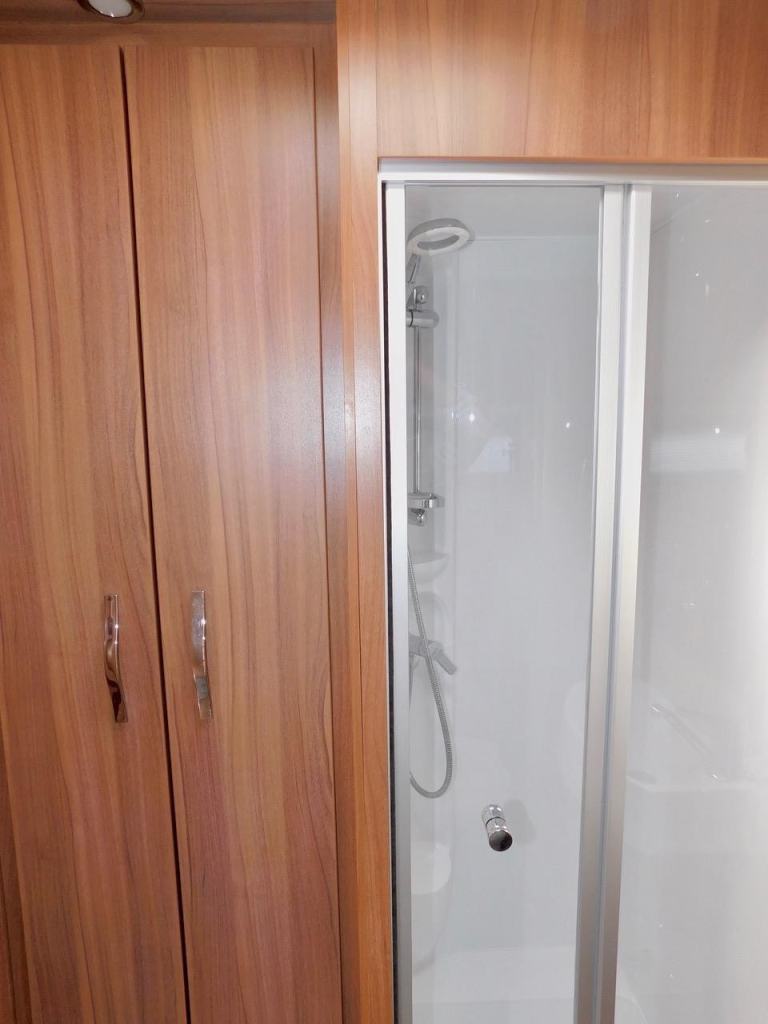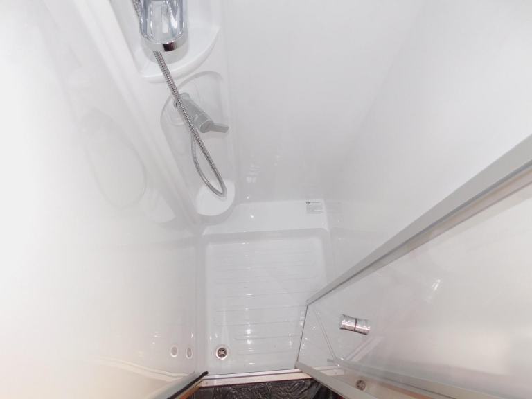 Walk-in fully lined shower cubicle with bi-fold doors.