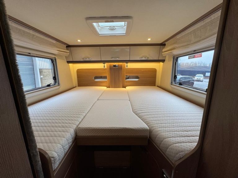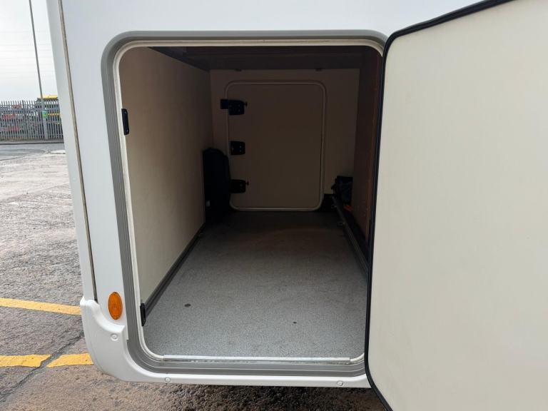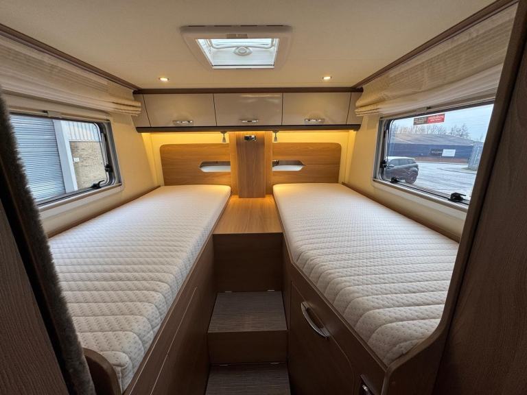 The interior is finished to a high standard with elegant upholstery, clever lighting and generous storage throughout. The well thought-out layout features fixed single beds to the rear of the van with large garage storage underneath accessible from both sides, central washroom with separate shower, flush toilet, sink and vanity unit, kitchen area equipped with hob, sink, oven with grill and full size fridge/freezer, front lounge area upholstered in beautiful cream leather creates a comfortable seating area ideal for relaxing and dining with the swivel cab seats providing additional seating, electric drop-down bed over the lounge area, 12/240V hook up, Truma heating system, Gas BBQ point, full length wind-out side awning, electric entrance step, TV ariel, solar panel, reverse camera, rear tow bar, DAB radio, cruise control,