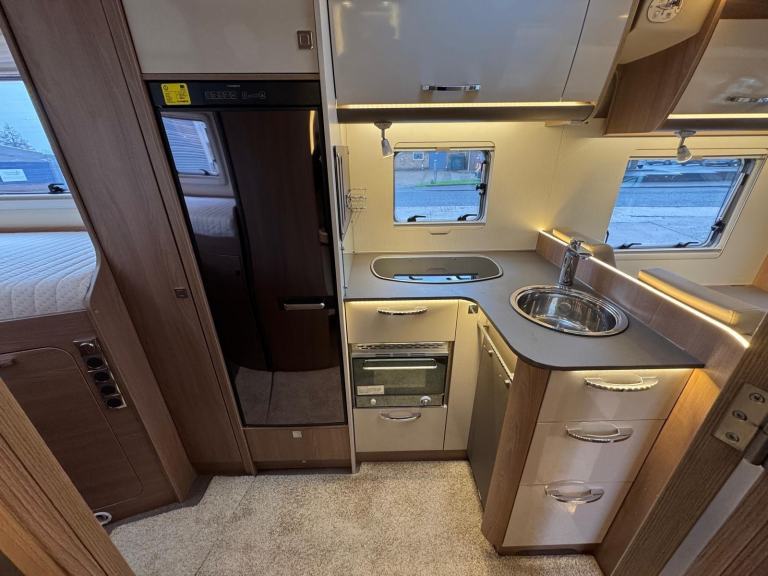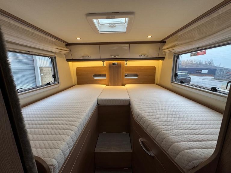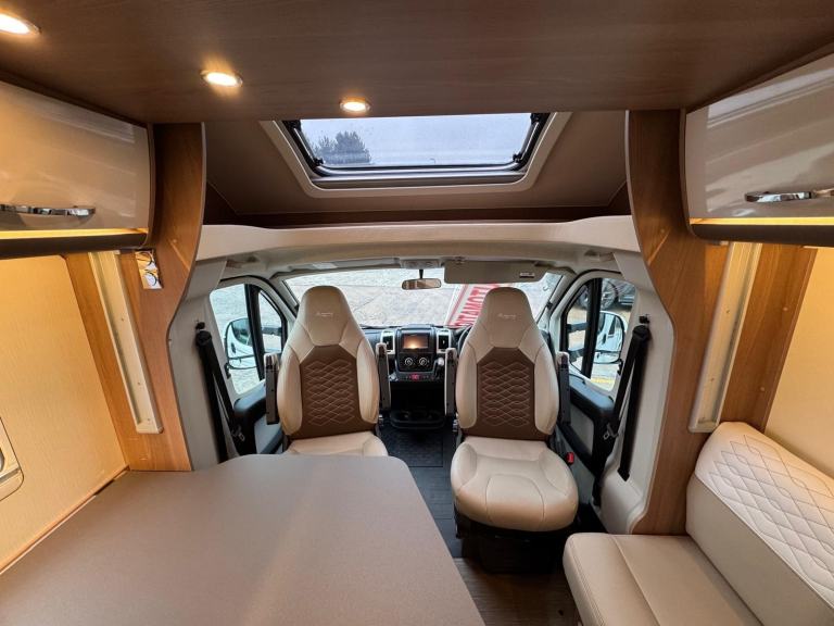 The interior is finished to a high standard with elegant upholstery, clever lighting and generous storage throughout. The well thought-out layout features fixed single beds to the rear of the van with large garage storage underneath accessible from both sides, central washroom with separate shower, flush toilet, sink and vanity unit, kitchen area equipped with hob, sink, oven with grill and full size fridge/freezer, front lounge area upholstered in beautiful cream leather creates a comfortable seating area ideal for relaxing and dining with the swivel cab seats providing additional seating, electric drop-down bed over the lounge area, 12/240V hook up, Truma heating system, Gas BBQ point, full length wind-out side awning, electric entrance step, TV ariel, solar panel, reverse camera, rear tow bar, DAB radio, cruise control,