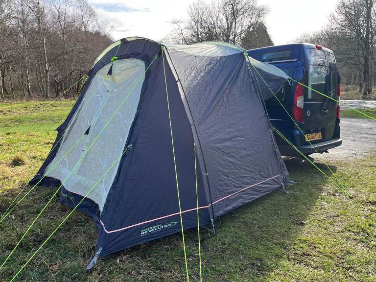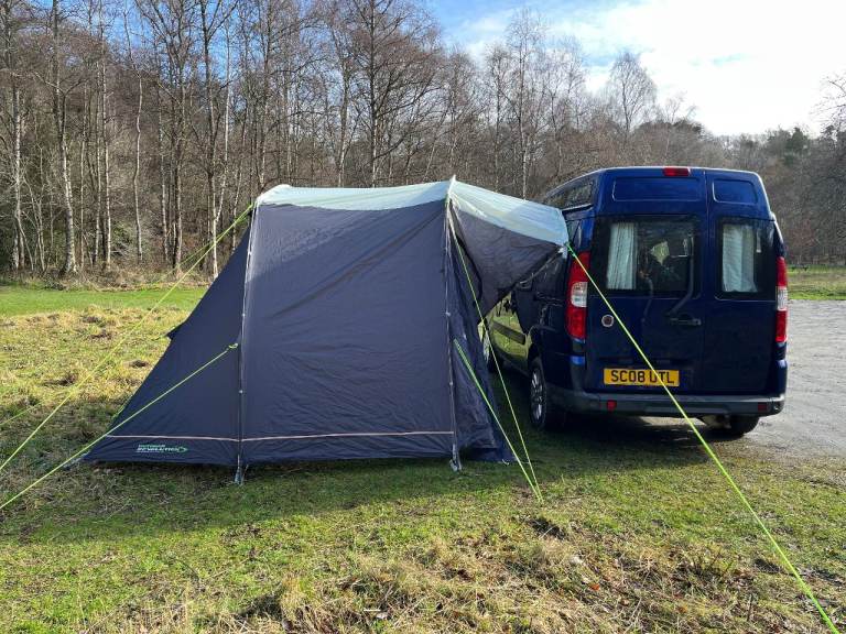 Sale includes a brand new, unused awning (with groundsheet, not pictured). The van comes with curtains, shelf storage net, hook up cable, fire extinguisher, gas canister, jazzy front seat covers, and a range of new hooks and attachment points ideal for clipping pet restraints to.