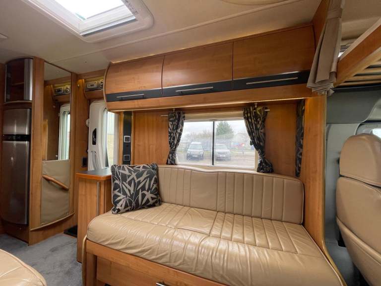 Comprising of a modern interior, rear bedroom offering a private space with fixed island bed, separate shower with adjacent washroom with flush toilet, sink and vanity unit, kitchen area equipped with full size fridge & freezer, sink, microwave, oven, hob and grill, spacious front lounge with a large seating area that easily converts into an additional double bed, over cab double bed, captain front swivel seats, electric entrance step, large wind-out side awning, rear garage, rear tow bar, roof ladder, cab air con, cab blinds, electric windows and door mirrors, cruise control, reverse camera, solar panel, Tv/ariel point.