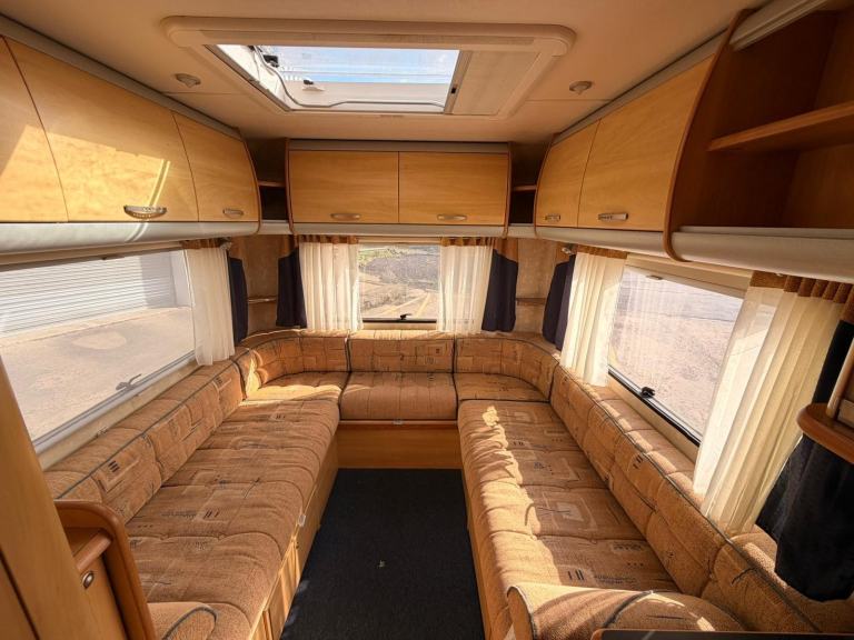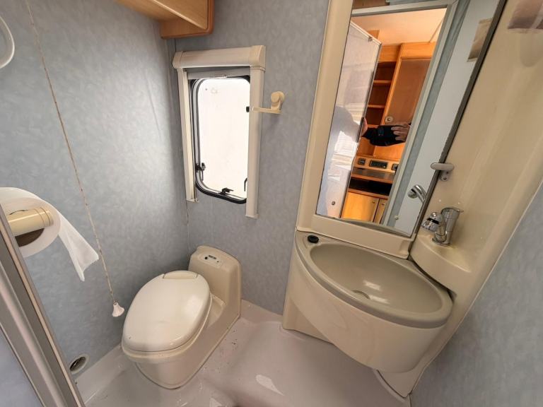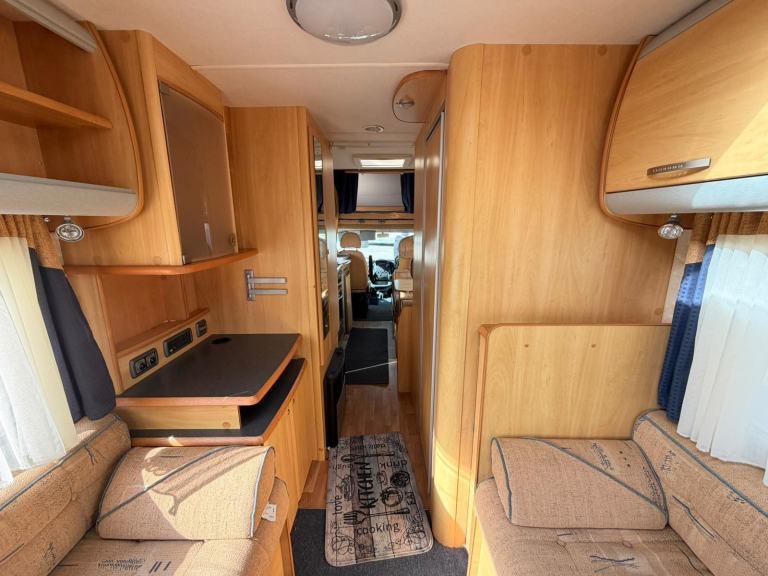 HEAR WE HAVE A 6 BERTH MOTOR HOME LARGE REAR LOUNGE THAT MAKES DOUBLE BED CENTRE DINETTE WITH SEAT BELTS THAT MAKES DOUBLE BED AND OVER CAB DOUBLE BED . LARGE BATH ROOM WITH FLUSH TOILET SHOWER WASH BASIN AND VANITY UNIT ON BOARD FRESH AND WAST WATER TANKS 12/240 VOLT HOOK UP FULL OVEN HOB AND GRILL FRIDGE SINK . BLOW AIR HEATING FLY SCREENS AND BLINDS TO ALL WINDOWS READY TO USE LOW MILEAGE DRIVES PERFECT MAY PX TEL 01274 687800 OR [Phone number removed]