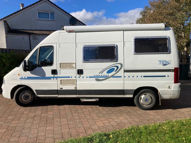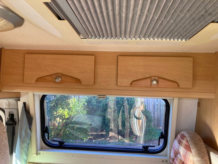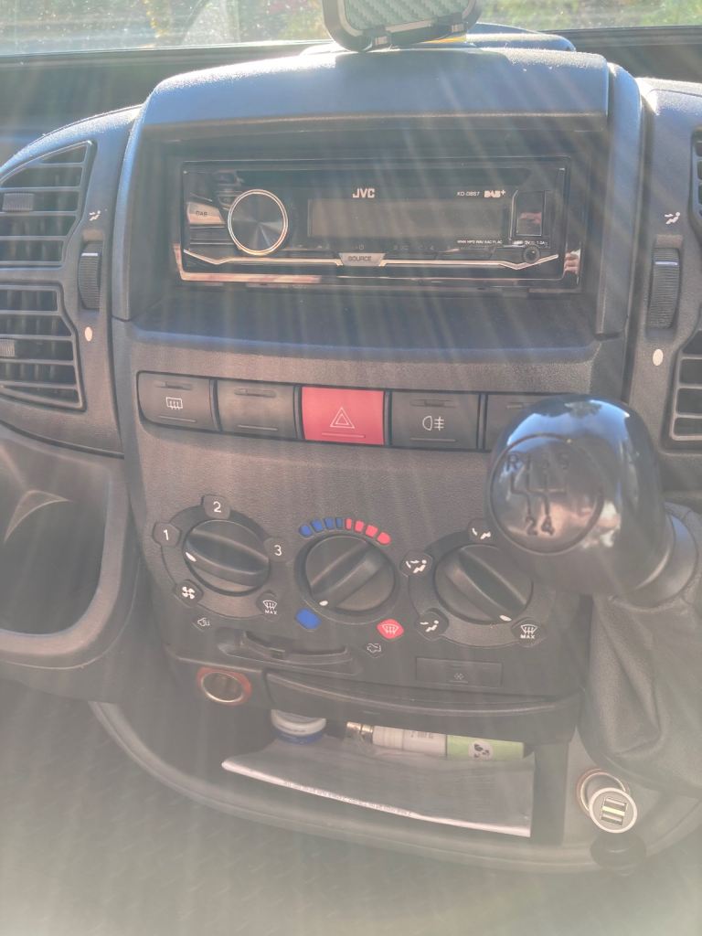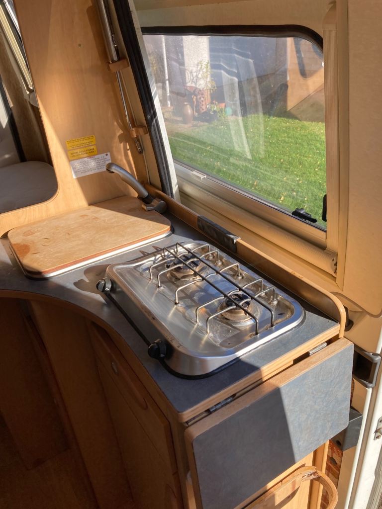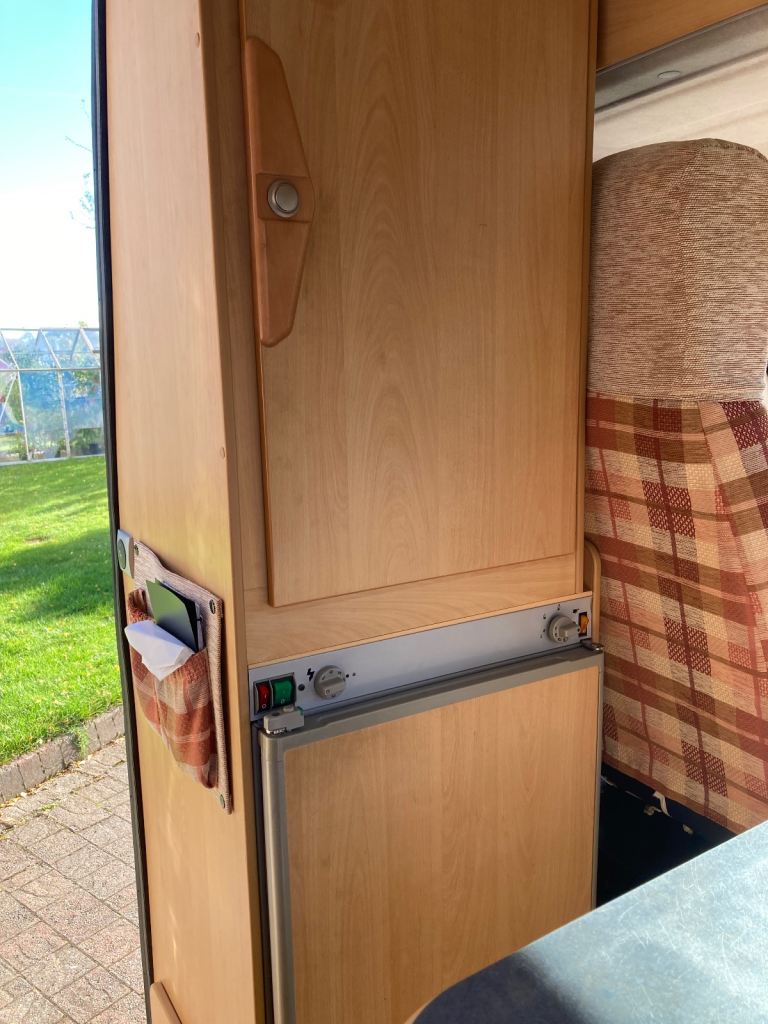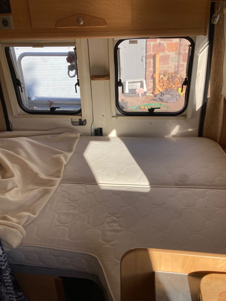 Three berth campervan (there is a permanent double bed in the back, the table folds down to make the third bed). Swivel front seats allow up to four people to sit around the table. Seat belts for four passengers. New leisure battery in August 2024. Two ring gas cooker with gas bottle and spare. Gas or electric (on mains hookup) fridge. Cassette toilet. Generous storage throughout the cabin and beneath the bed. Fiamma awning. MOT to 10th September 2026. Three new tyres (rear and spare) fitted March 2026, front tyres have good tread. Solar panel for trickle charging the leisure battery. Comes with roof bars, and also a unique system (designed and built by the last owner) that allows a canoe to be hauled on to and off the bars!
