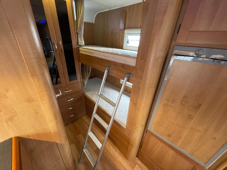 This van comprises of rear bunk beds, spacious washroom with separate shower, flush toilet, sink and vanity unit, kitchen area equipped with sink, fridge with freezer box, microwave, oven, hob and grill, centre dinette that makes into large double, over cab double, TV/Areal point, 12/240V hook up, blow air heating, electric entrance step, large wind-out side awning, rear tow bar, reverse camera, cab air con, cab blinds, electric windows and mirrors.