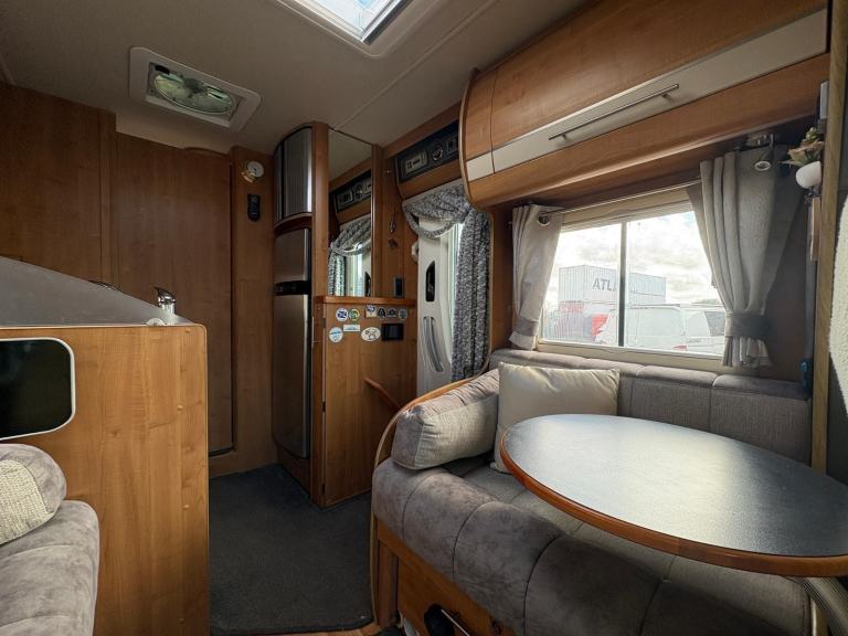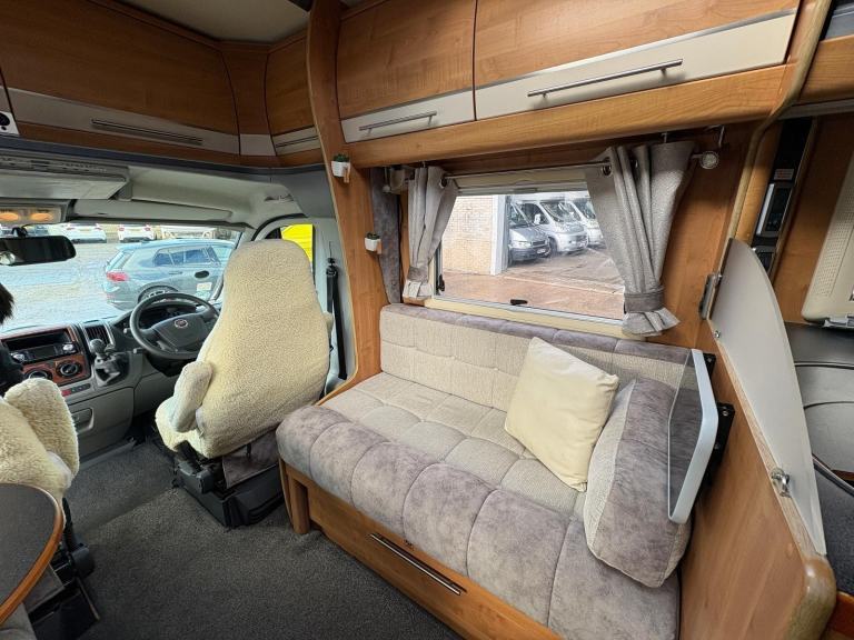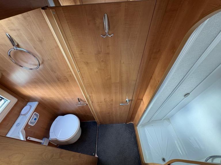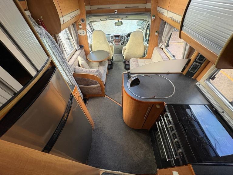 This van comprises of a dinette area with bench style seating that makes into a double, the captain front swivel seats easily accommodate 4 people for dining, kitchen area equipped with full size fridge and freezer, sink, oven, hob and grill, 2 single beds to the rear with a full size shower and separate washroom with flush toilet and vanity unit, 12/240V hook up, blow air heating, fly screens and blinds fitted to all windows, rear tow bar, roof ladder, cab blinds, electric windows and door mirrors, self levelling, this van can not be driven on a car licence.