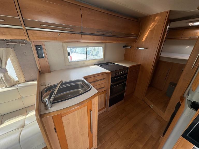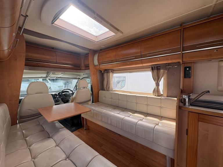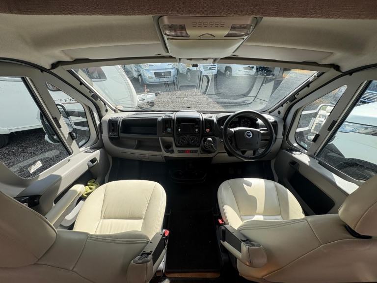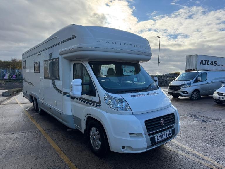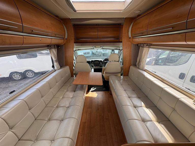 Fiat Autotrail Chieftan 4 berth tag axle motorhome with fixed raised bed over garage, full size shower, separate washroom with flush toilet, sink and vanity unit, kitchen area equipped with full size fridge and freezer, microwave, sink, oven, hob and grill, front dinette with bench style seating that can be used as 2 singles or makes a large double, electric entrance step, large wind-out side awning, rear roof ladder, tow bar, fly screens and blinds fitted to all windows, 12/240V hook up, blow air heating. and much more px to clear
