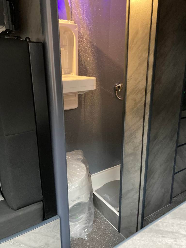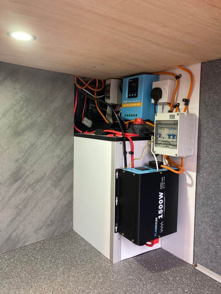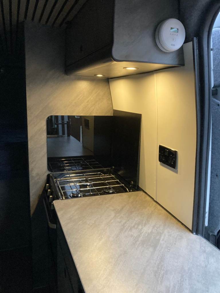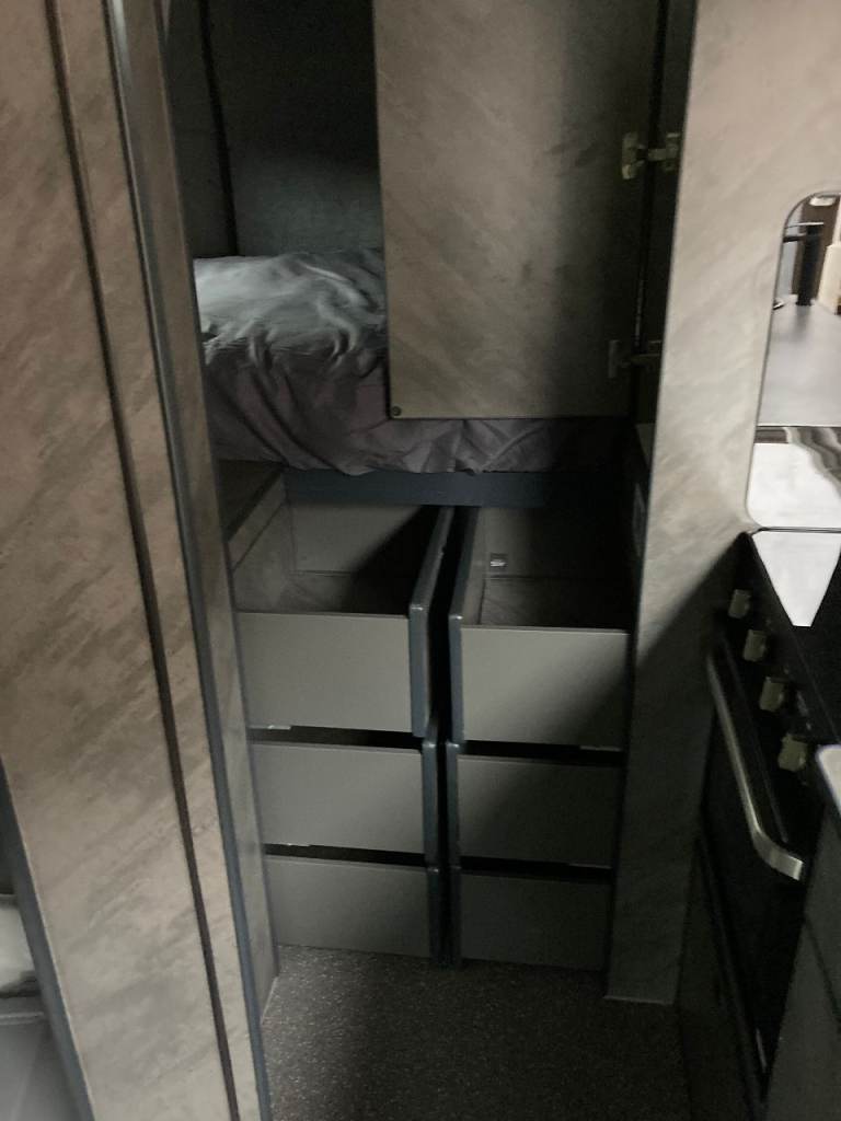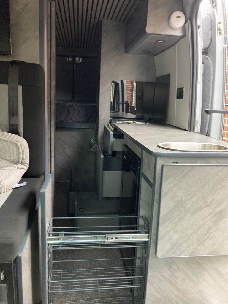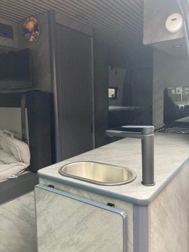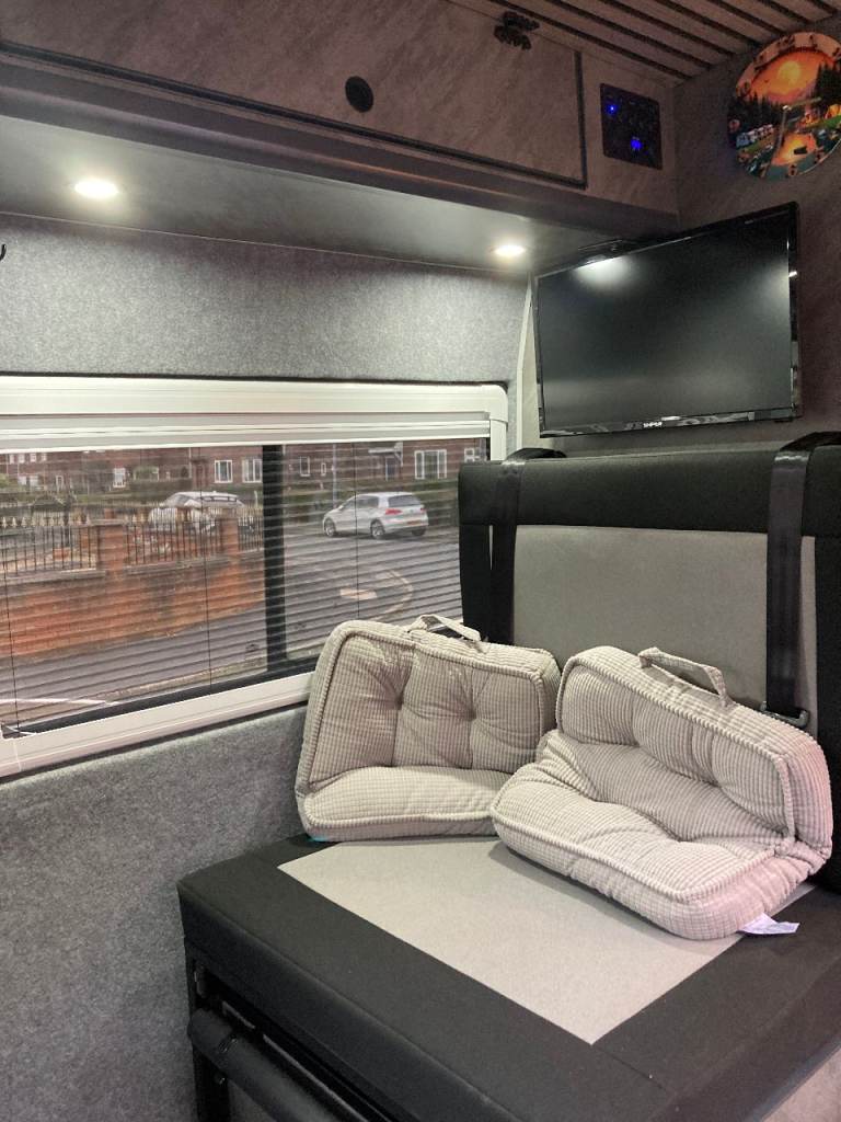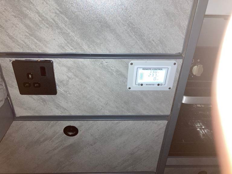 Off grid 500 wat solar, 300 A/H lithium battery, Inverter, 80L onboard water tank, 70L under slung waste tank, 15L under slung refillable LPG tank, 6ft x 4ft fixed double bed, 4 travel seats, small pull out bed for one child or two small kids. 22 inch TV/DVD. Front swivel seats, Air con, alloys, 6 speed with cruise control, reverse camera, Truma combi, Cooker hob oven and grill, 90L fridge with small freezer, cassette toilet drop down sink and small shower, Loads of storage and large garage, Manual step,