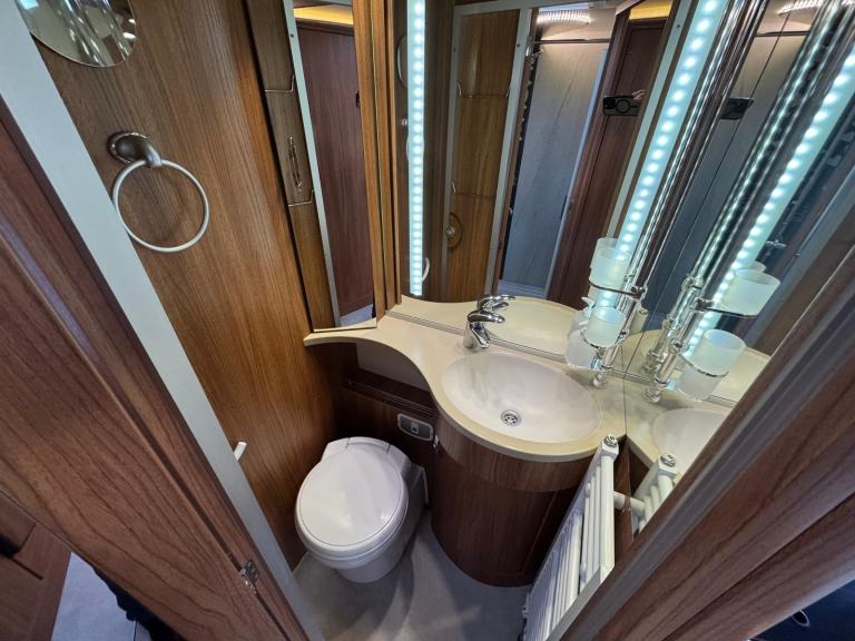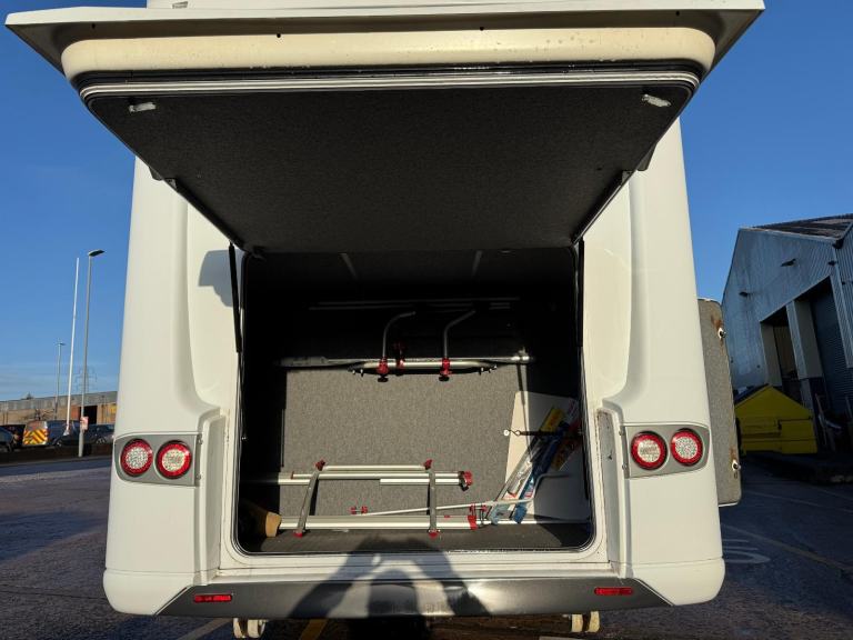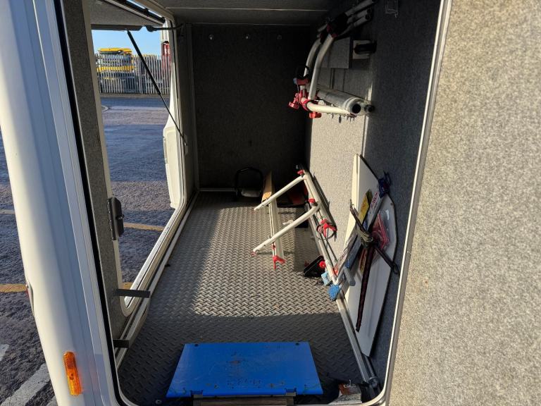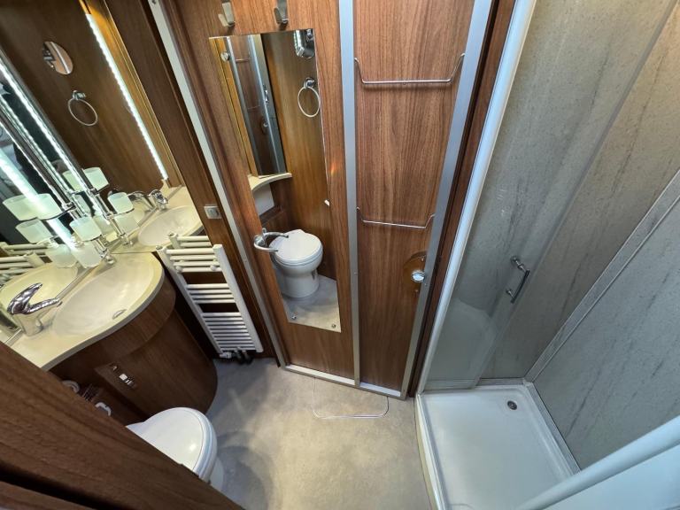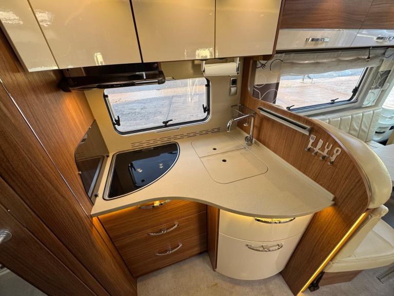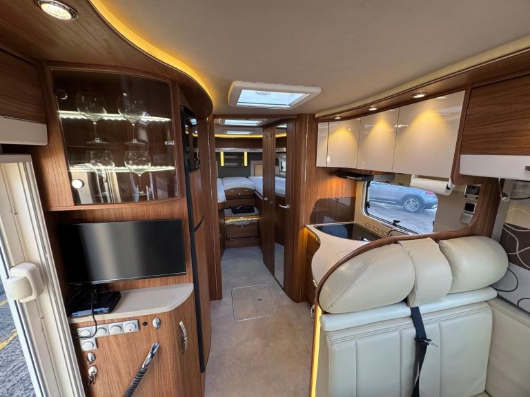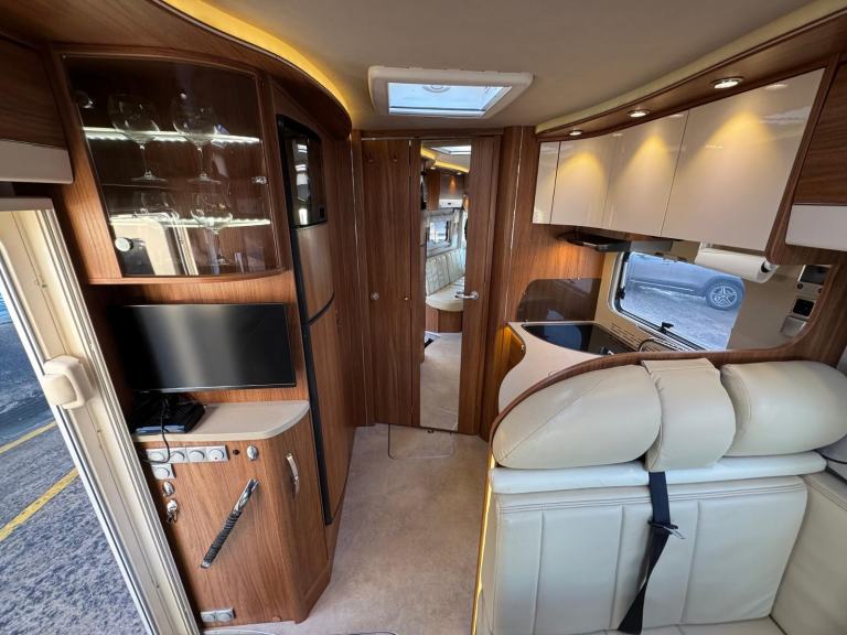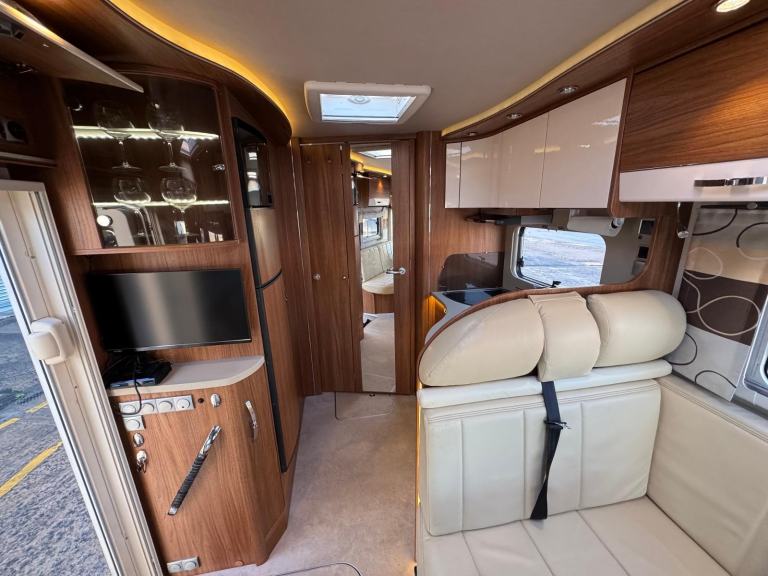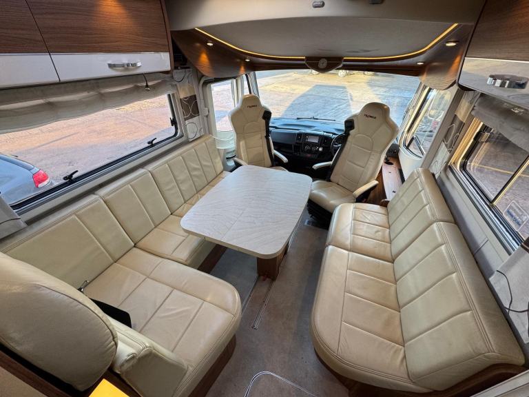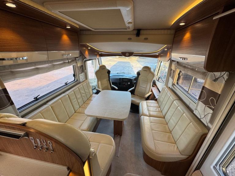 Additional features; self seeking satellite, large garage accessible from both sides of the van, Gas flow, Alde heating system, electric cab blind, solar panels, self levellers, cab air con and cruise control, electric entrance step and large wind-out side awning.