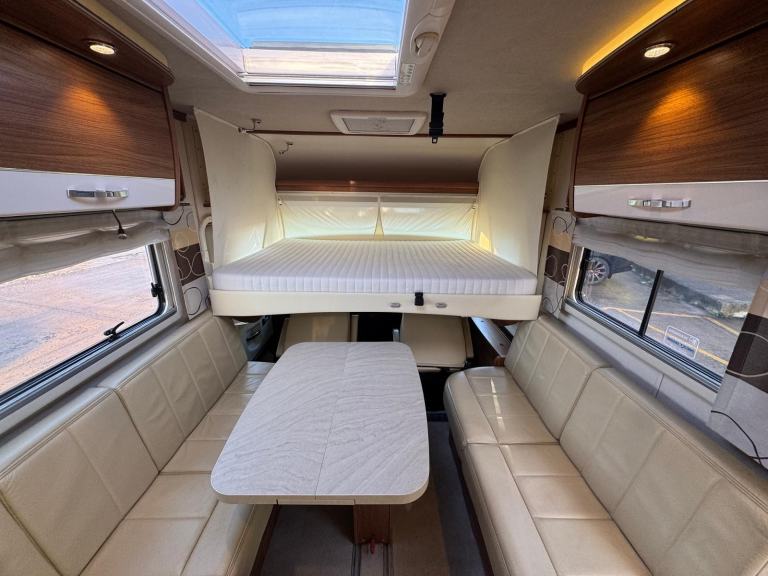 This rare highly sought after motorhome comprises of a bright and spacious living area with comfortable seating that easily converts into an additional sleeping space and an electric over cab bad providing another sleeping area.