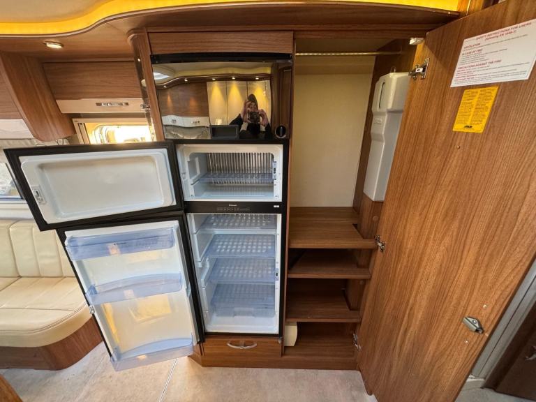 Fully equipped kitchen designed for extended touring with 3/4 gas burner, oven & grill, large fridge/freezer and ample workspace.