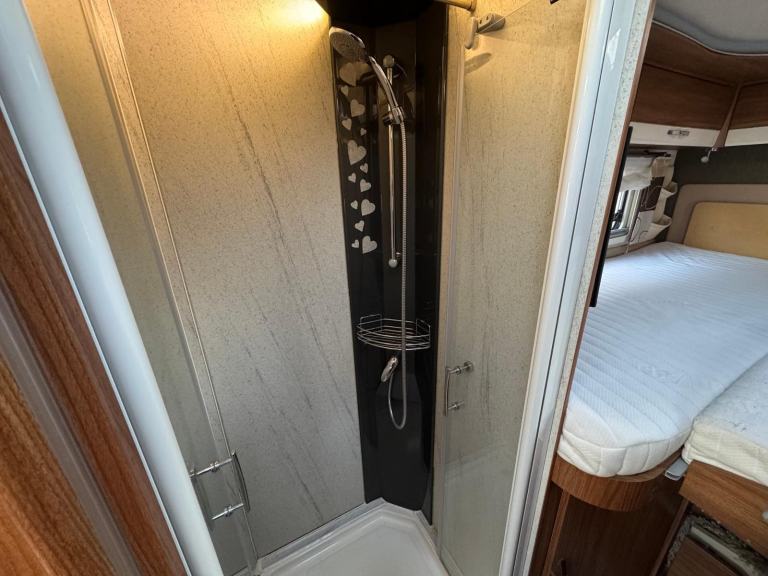 To the rear of the van is a large fixed bed and spacious washroom with separate shower cubicle, Thetford cassette toilet, sink and vanity unit.