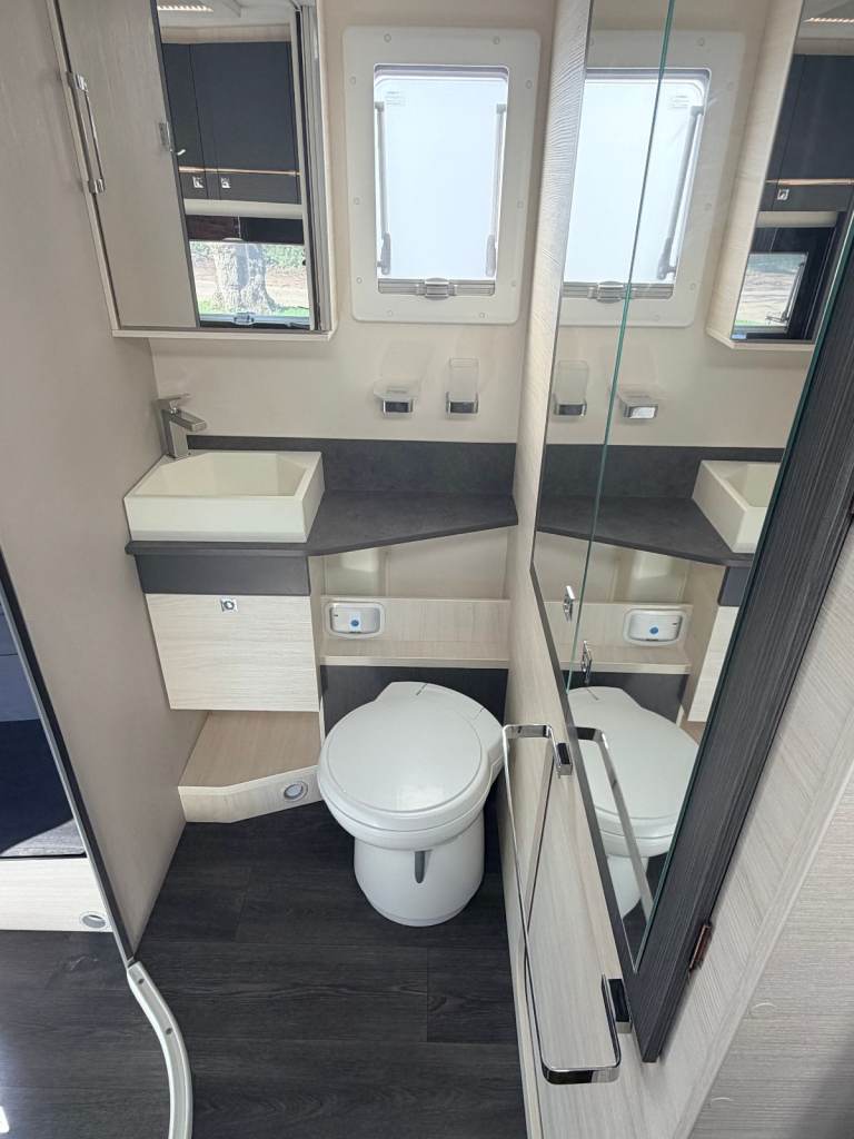 This top of the range A-class has a luxury feel throughout with half leather upholstery, roman blinds, LED lighting, ALDE heating and memory foam mattresses.