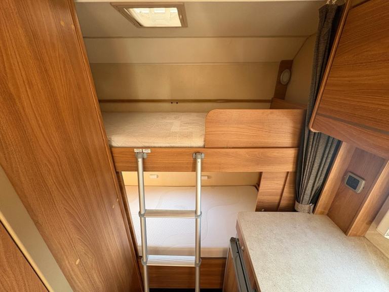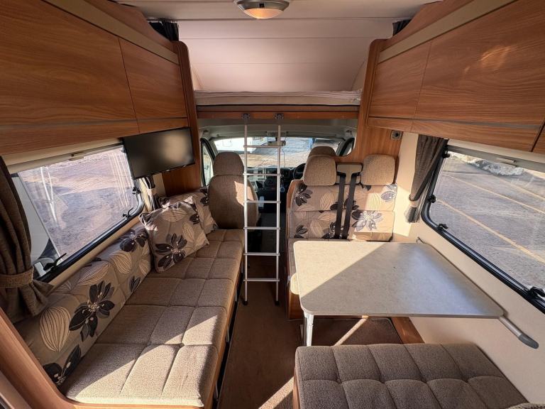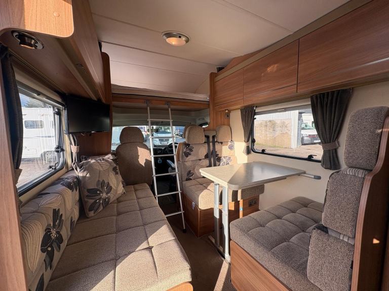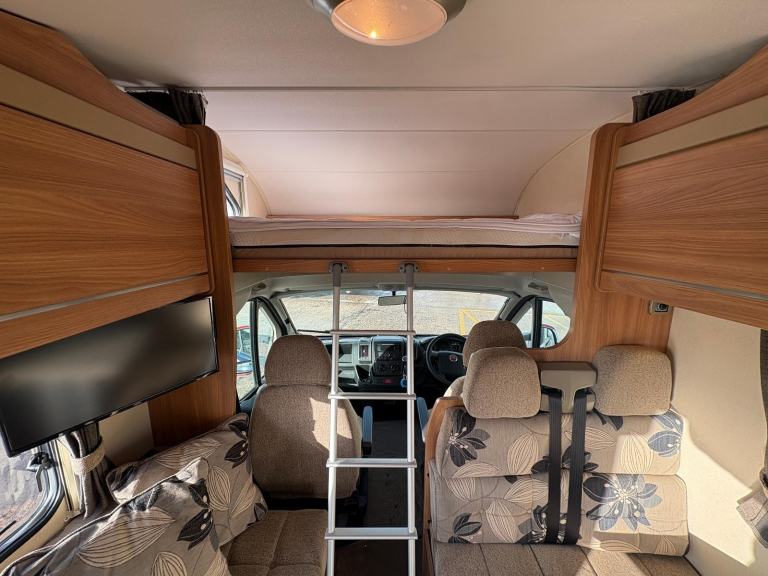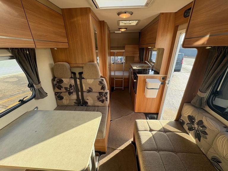 This motorhome provides comfortable accommodation and living space for a family or group of adults. The layout is a UK favourite, even down to the habitation door being on the nearside of the vehicle and features a front pullman dinette, the rear bunk beds and garage space.