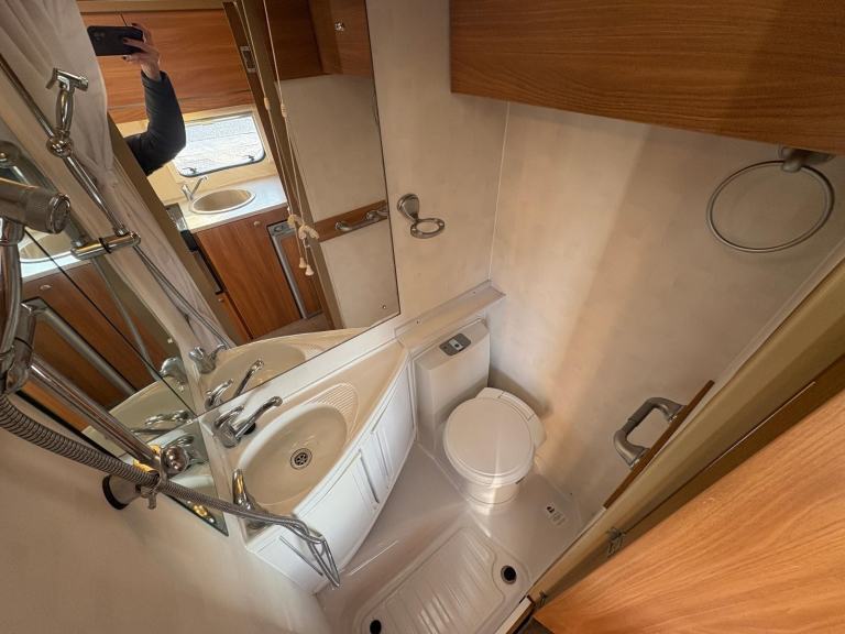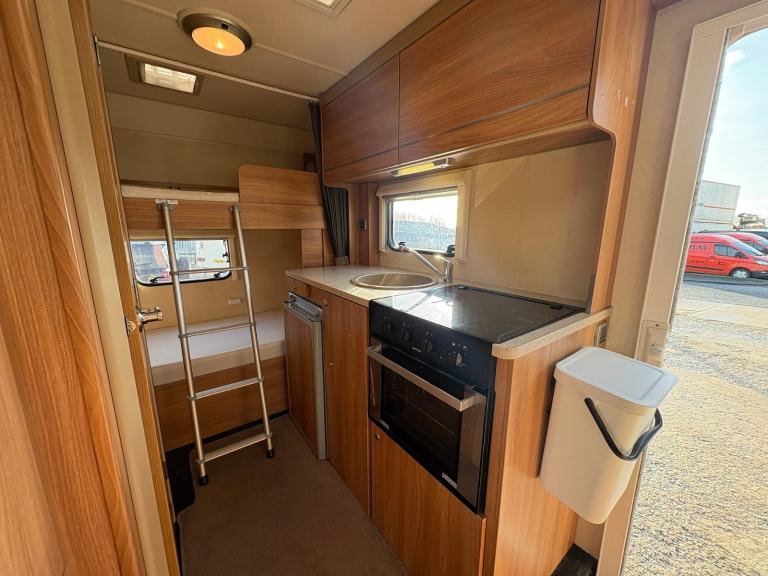 At the rear are the two bunks beds, with the lower bed being able to be stowed away to allow the garage to be used for bigger items to be carried. Moving forward is the well-appointed washroom with a swivel Thetford cassette toilet, vanity washbasin, mirror, integral shower, medicine cabinet storage and skylight. The galley kitchen runs from the doorway back along the nearside wall and includes a Thetford three-way powered fridge, a Dometic 3 gas burner hob, Thetford combination oven and grill, circular sink with mixer tap and worktop, cupboard and locker space. Truma space heating and hot water controls, on gas and electric. Adjacent is the dinette area, which can comfortably seat six people around the extendable table and incorporates four passenger seat belts, the dinette converts into a double bed at night and there is a wall mounted TV. Finally, there is the generous over-cab double bed and side window, this bed base lifts up on supports to allow easier access to the cab area.