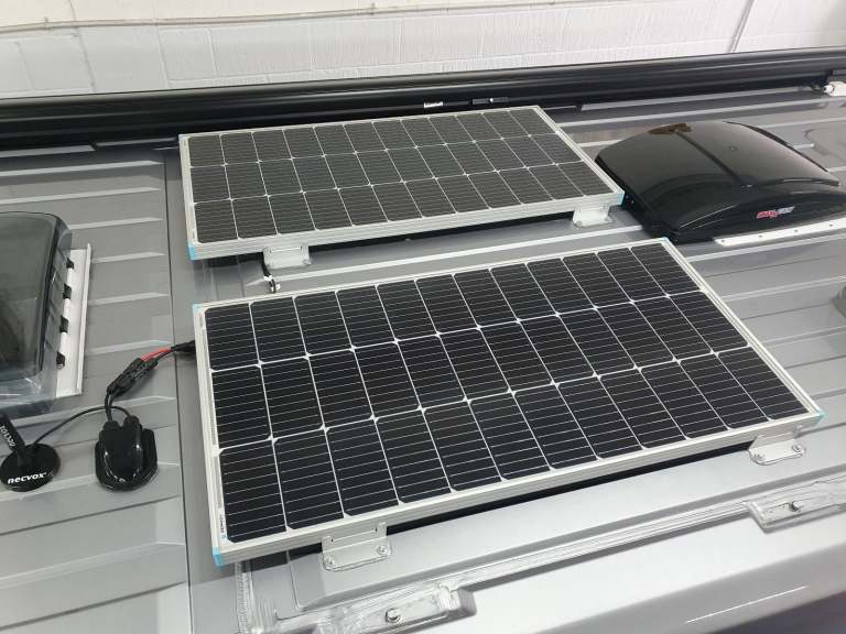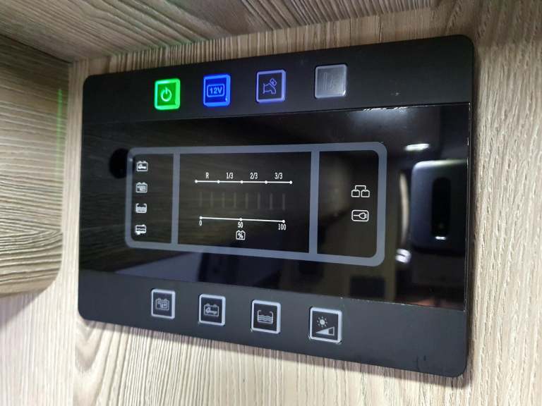 The vehicle offers multiple LED downlighters, rear courtesy lamps with USB charging ports, and recessed lighting under overhead lockers. Individual controls allow customization for the perfect ambient lighting. Additionally, there are 4x 230v mains sockets and 1x 12v socket located in the lounge and kitchen. The vehicle is equipped with 2x 110 Amp deep cycle leisure batteries charged by 2x 100w solar panels fixed to the roof, ensuring sustained power. A NEC Box digital aerial on the roof ensures optimum TV reception, while an LED strip light fixed to the exterior wind-out awning provides external illumination.
