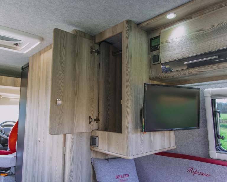 The front cab area boasts twin captain’s swivel chairs upholstered in the exclusive Ripasso fabric trim. A convenient small dinette table is stored above the cab for added functionality.