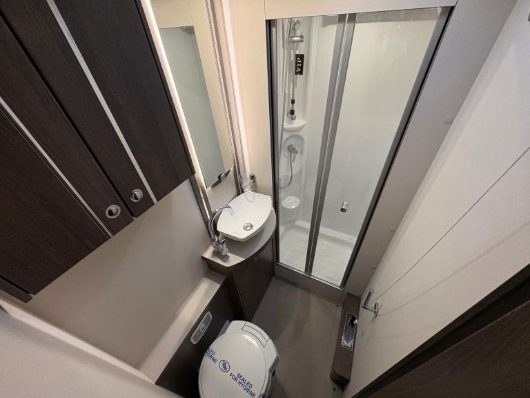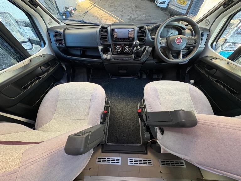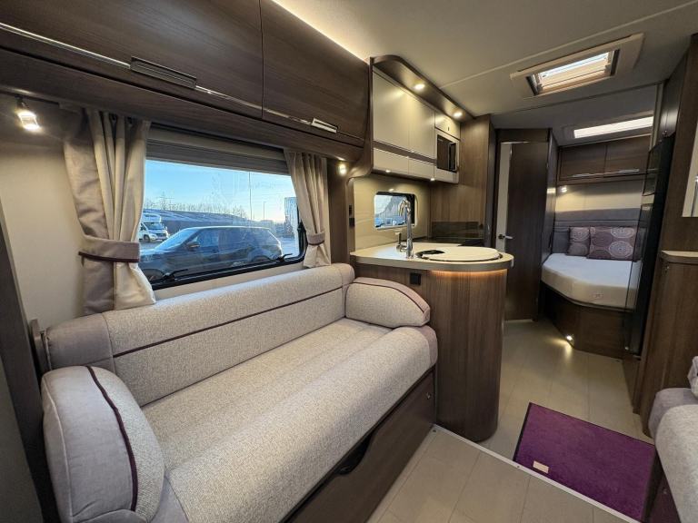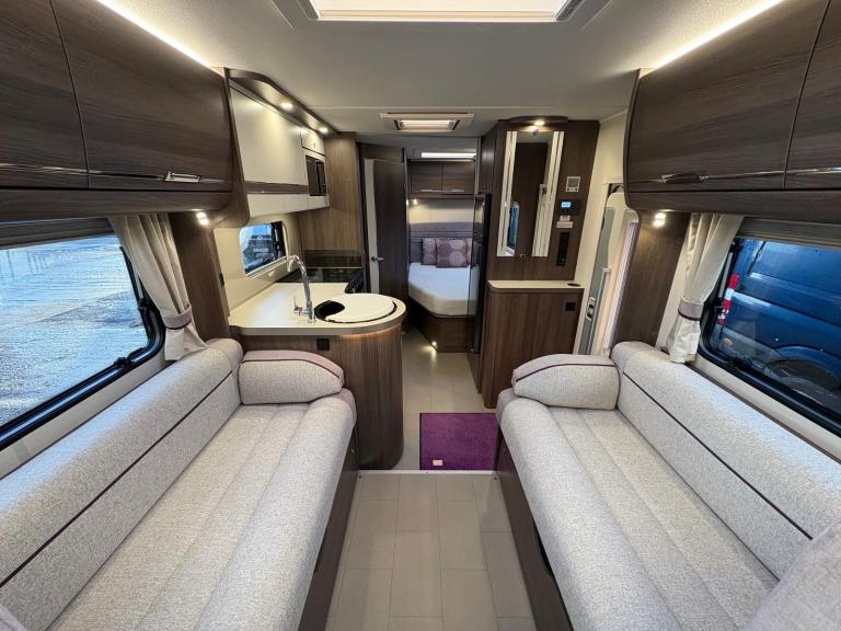 The van comprises of a modern and spacious layout; to the rear is a washroom with Thetford cassette toilet, standalone shower and sink with vanity unit, rear bedroom area with French bed and wardrobe compartment, kitchen area equipped with sink, hob with 3x gas rings and an electric ring, separate oven and grill, microwave, 3-way full size fridge and freezer, under cupboard lighting, lounge area with bench style seating that easily converts into a double bed, captain front swivel seats provide additional seating for dining, 12/240V hook up, ALDE heating and hot water system which can be run off gas or electric, cab air con, electric windows and mirrors, multi function steering wheel with cruise control, DAB radio, large wind-out side awning.