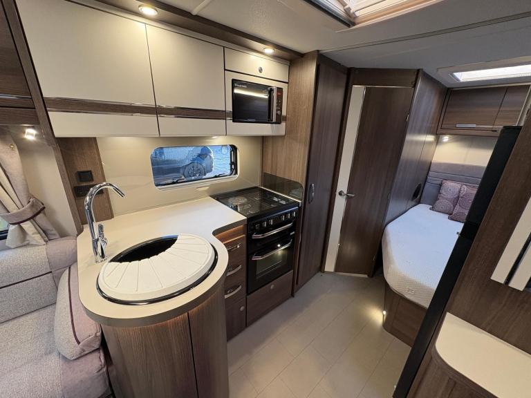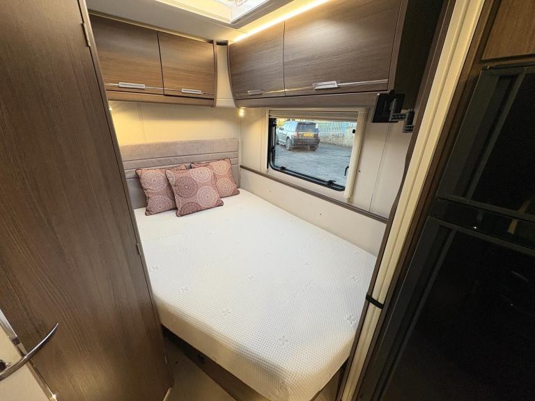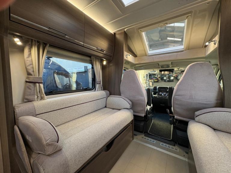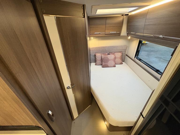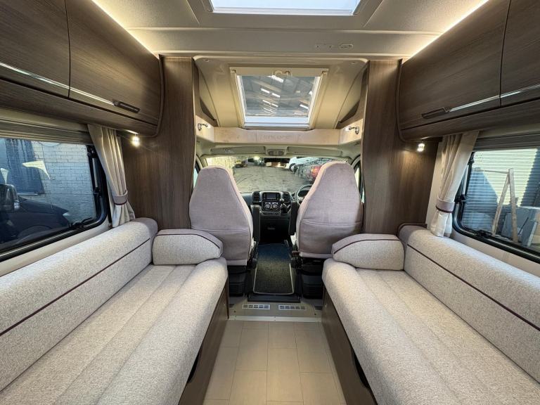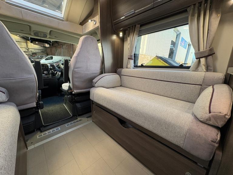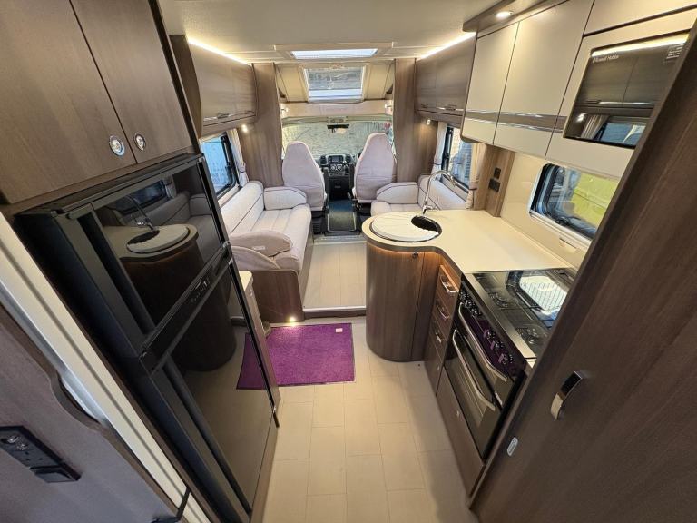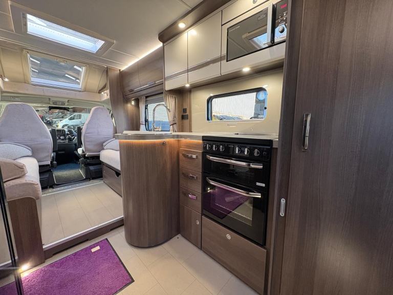 The van comprises of a modern and spacious layout; to the rear is a washroom with Thetford cassette toilet, standalone shower and sink with vanity unit, rear bedroom area with French bed and wardrobe compartment, kitchen area equipped with sink, hob with 3x gas rings and an electric ring, separate oven and grill, microwave, 3-way full size fridge and freezer, under cupboard lighting, lounge area with bench style seating that easily converts into a double bed, captain front swivel seats provide additional seating for dining, 12/240V hook up, ALDE heating and hot water system which can be run off gas or electric, cab air con, electric windows and mirrors, multi function steering wheel with cruise control, DAB radio, large wind-out side awning.