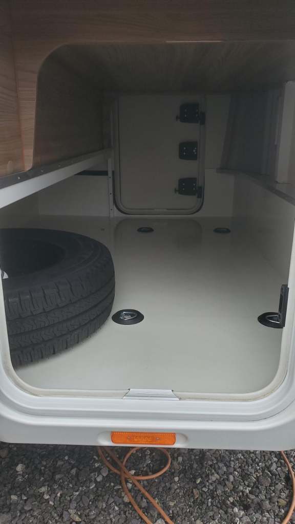 Rear garage with access from both sides of vehicle, with 12V strip lights both sides and a 230V standard plug point.