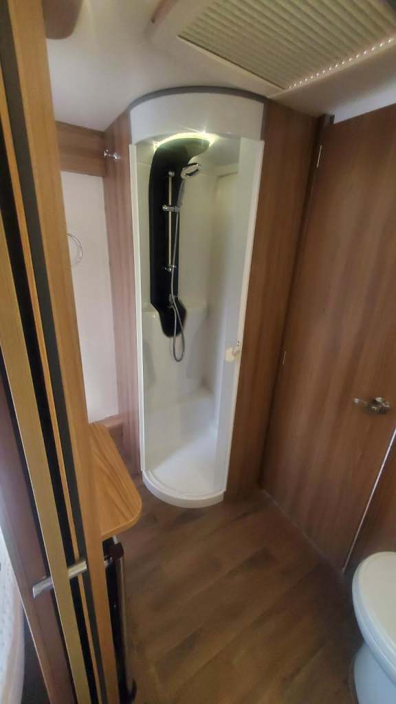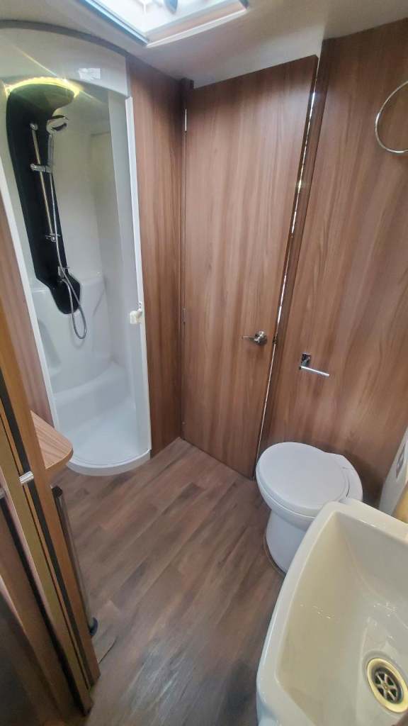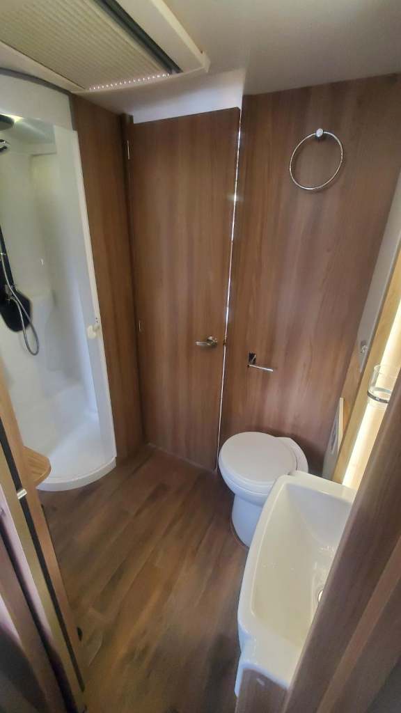 Full bathroom with large shower, toilet, wash basin, and towel rail, bathroom is the full width of the vehicle.