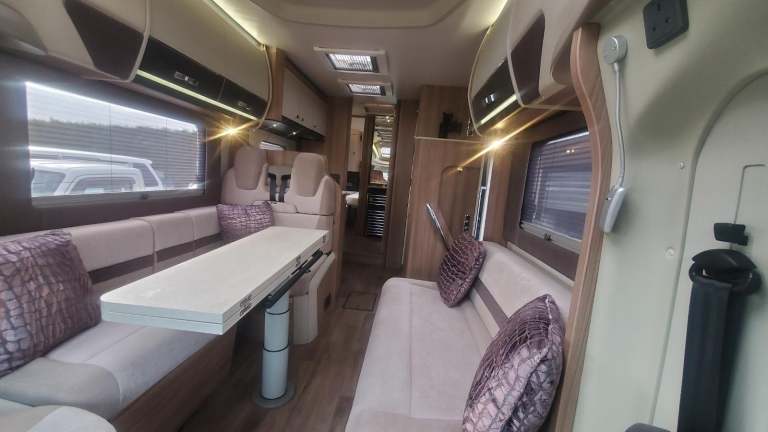 Large seating, dining area with overhead lockers, sky lights, and 12V LED lighting. Two front facing travelling seats with seat belts.