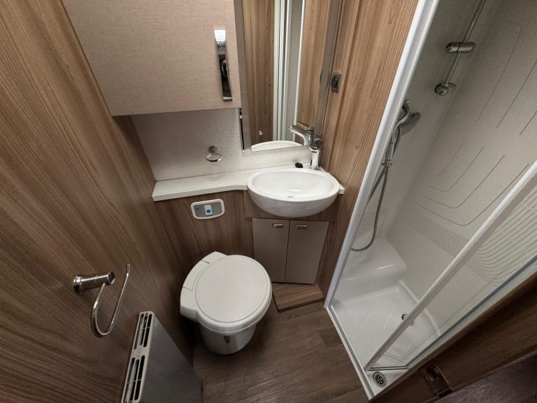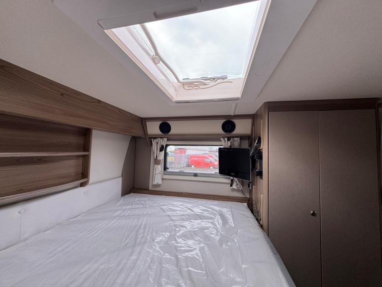 Inside, the layout is both versatile and luxurious, featuring a front lounge that converts into a comfortable double bed, a rear transverse double bed, . The interior is beautifully finished with blinds and flyscreens throughout, speakers throughout, ample storage, and thoughtful touches such as a TV with DVD in the lounge, TV bracket in the bedroom, and USB points in the cab area. Swivel cab seats and a multifunction steering wheel enhance both the driving and living experience. The well-equipped kitchen includes a 3-burner gas hob plus electric ring, Dometic oven and grill, Dometic fridge/freezer, microwave, and extractor fan, making it ideal for extended touring. Comfort is assured year-round thanks to the premium Alde heating and hot water system, while the spacious washroom features a Thetford toilet and excellent facilities.