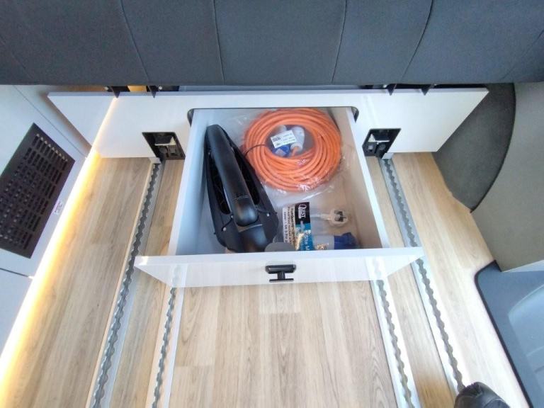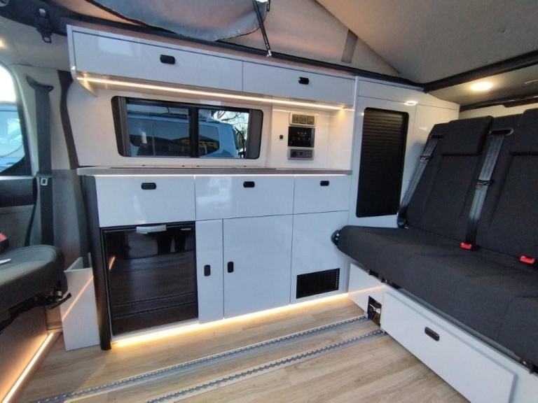 The standard spec will include as below, also when comparing with other campervans its always worth comparing like for like on the conversion specification. Tailgate shower, Upper roof bed, Reversing Camera, Rear blinds on all windows, Gas low, Lithium battery, Dark rear tinted windows, Webasto Heater with Mobile phone app and tracker, Webasto Hot Water System & Tailgate Shower, Lower bed Mattress (Air mattress) Gas BBQ point, 150w solar panel, Vitrifrigo slide out fridge, Extras included in the price, NAV Pack 5 £1200, Heated steering wheel £150