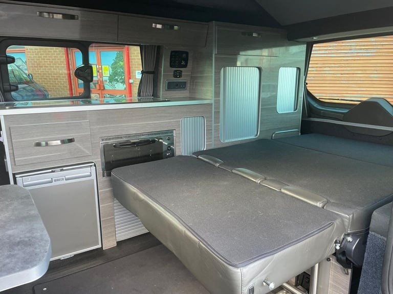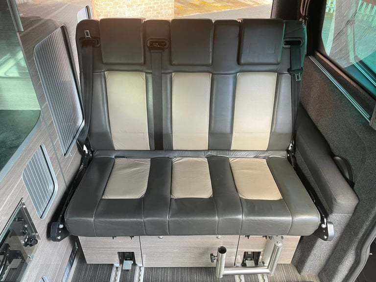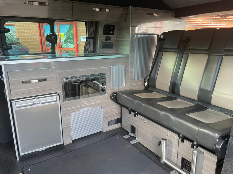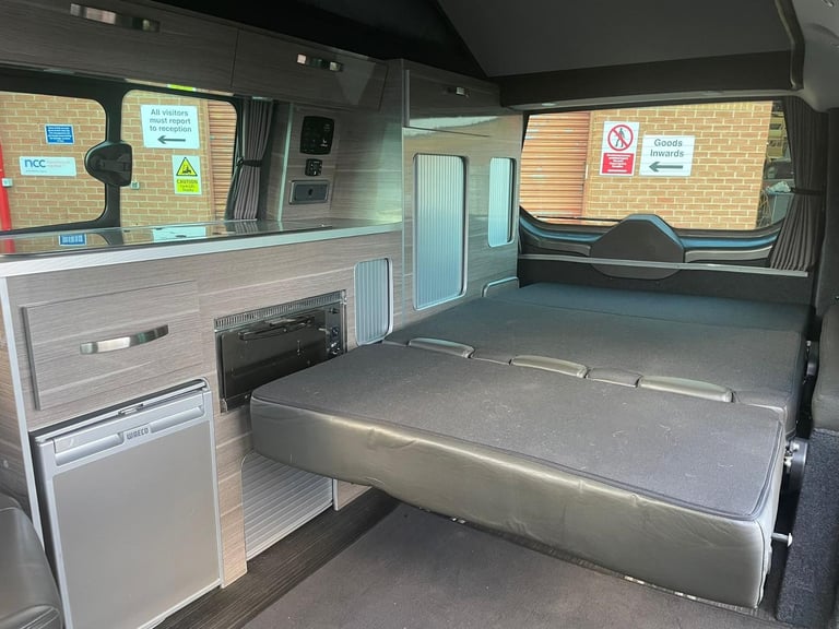 Terrier 1 side conversion, driver and passenger swivel seats with fly off handbrake, German SCA elevating roof, Reimo sliding seat system with 3 x rear seatbelts, glass top hob & sink, fresh & wastewater tanks, electric water pump, mains hook up, leisure battery, solar panel, compressor fridge, porty potty, Eberspacher 2KW blown air heating, Electric Folding Step, Cab to rear access:
