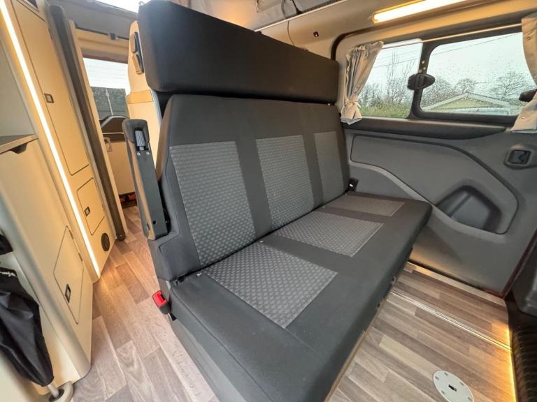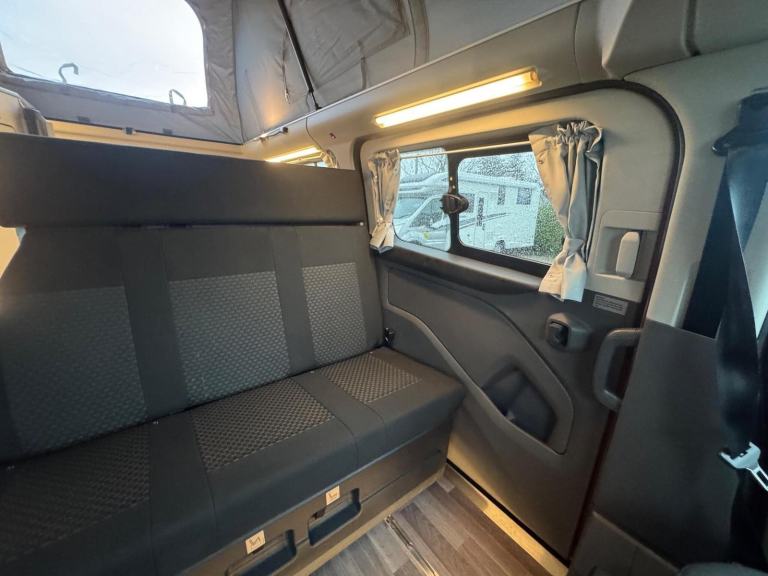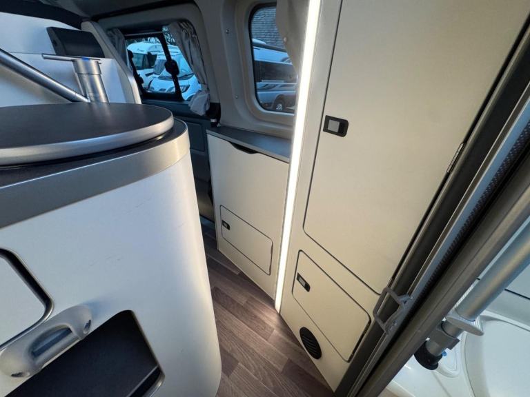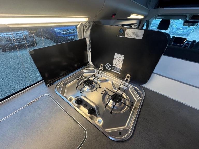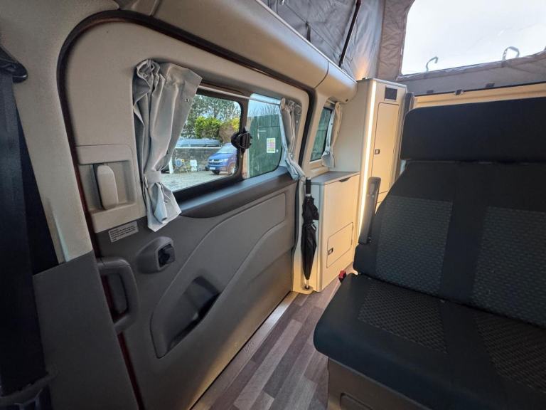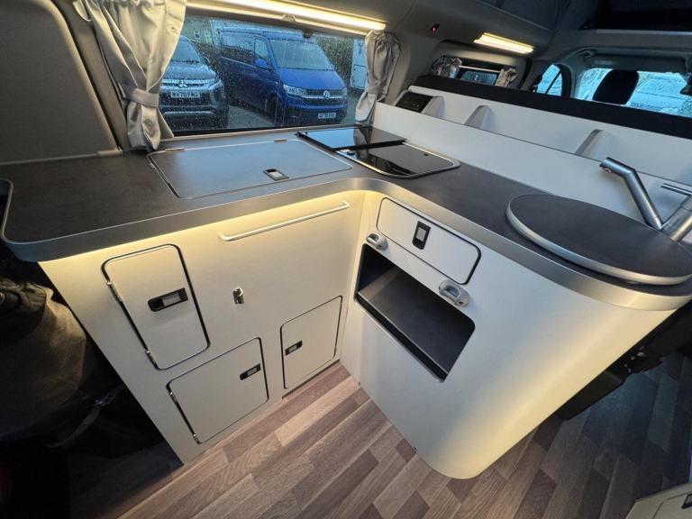 One of the standout features of the Nugget Plus is its clever, factory-designed interior. Unlike many campervans, this model benefits from a dedicated rear washroom complete with a toilet, along with hot water, making it perfect for off-grid stays and longer holidays. The rear kitchen layout provides excellent workspace and storage, while the main living area remains open and sociable.