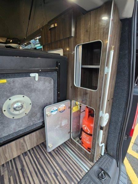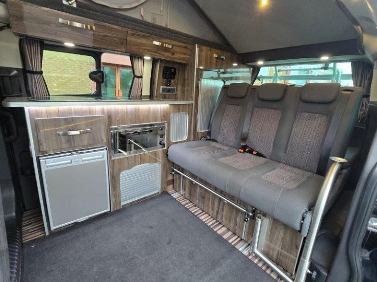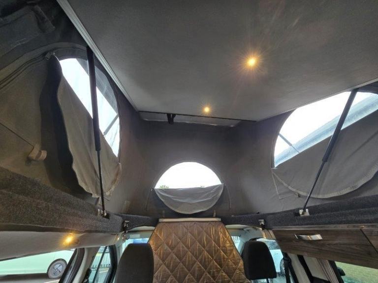 Terrier 1 side conversion, driver and passenger swivel seats with fly off handbrake, German SCA elevating roof, Reimo sliding seat system with 3 x rear seatbelts, glass top hob & sink, fresh & wastewater tanks, electric water pump, mains hook up, leisure battery, solar panel, compressor fridge, porty potty, Eberspacher 2KW blown air heating.