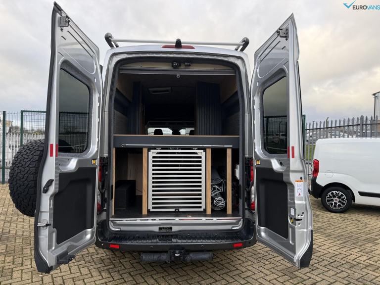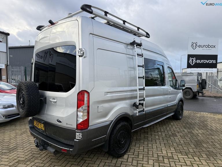 Find another one of these! Factory All Wheel Drive Transit with air conditioning, captains front seats and full âSwamperâ kit including Rogue Alloys with BFG tyres, colour coding, towbar, roof rack, ladder, awning, electric step etc. Comprehensively kitted out internally by a craftsman with high level bed, swivel seats with individual tables, secure storage or dog cages under the bed. It has all the right bits like diesel heating, a recent large capacity LG fridge, gas hob, sink, extractor fan, wifi, proper Cello TV, solar panel, leisure battery etc etc. What a stunning looking van. Off grid, off road camping, here we come!