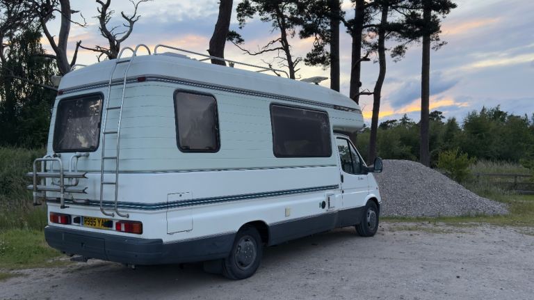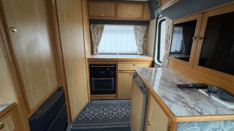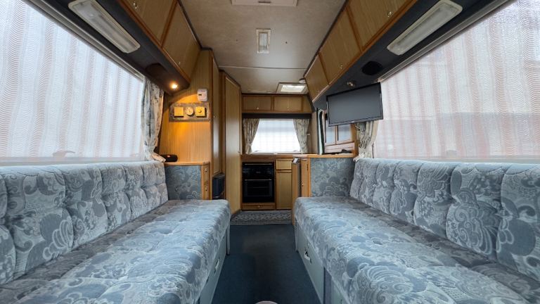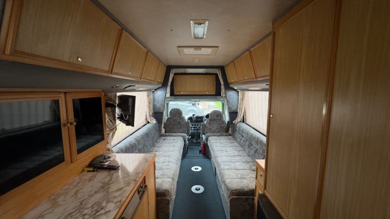 MOT until 24/06/26, Less than 1000 miles covered since last test. Spacious layout with a rear kitchen, washroom, and a large front lounge that converts into a double bed, gas fire, fridge, gas hob and oven, sink and TV.