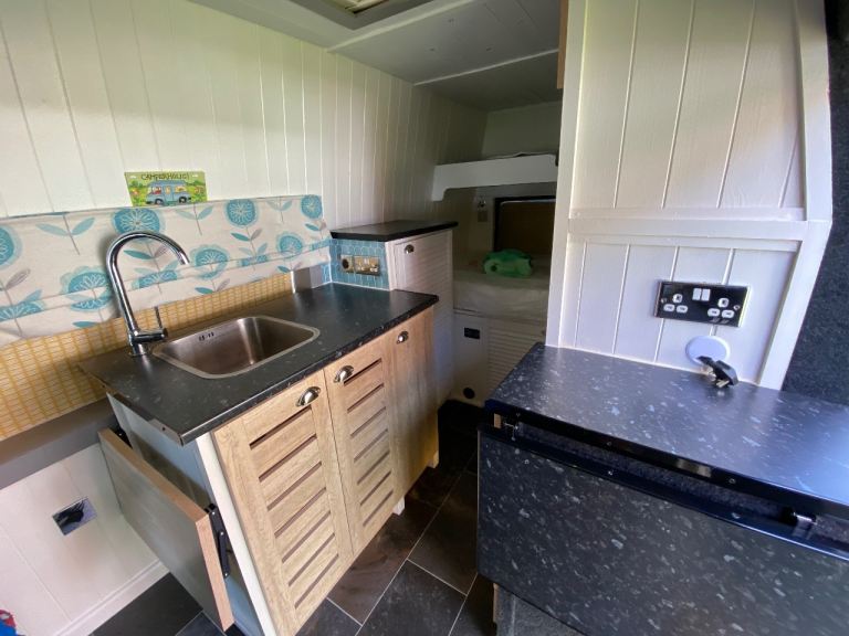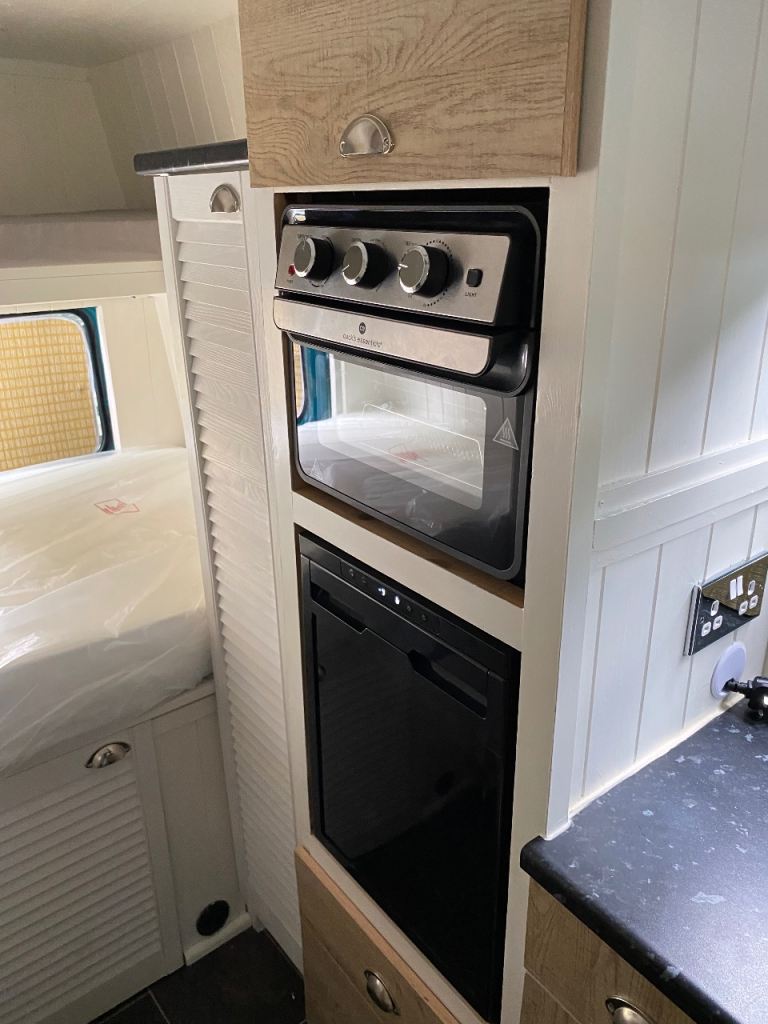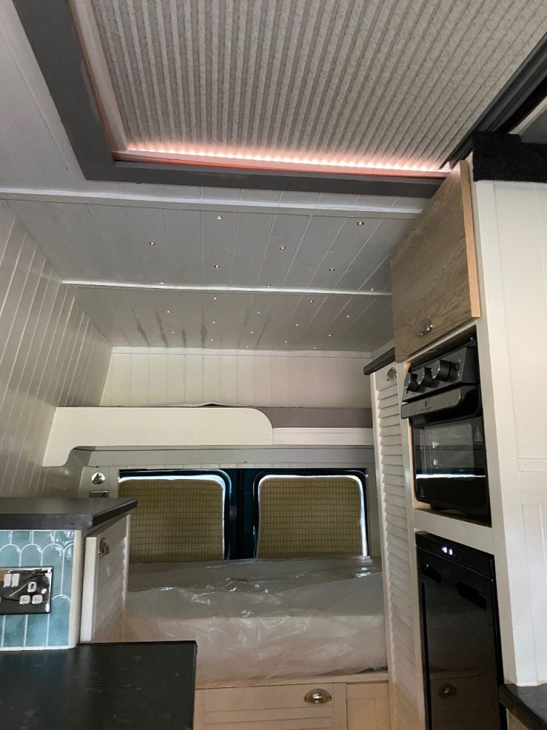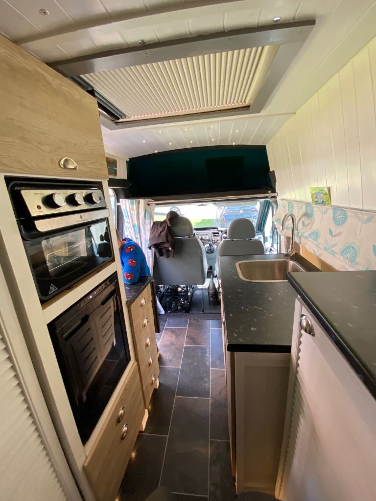 In the back it has bunk beds, diesel heater and truma boiler for hot and cold running water with freeze protection valve, a waste water tank under the sink, oven, fridge and separate gas hob. Inverter with 3 pin 240v sockets and USB charging sockets, twin leisure and twin starter batteries, the leisure batteries can charge in 3 ways through a split charger with twin solar panels on roof, an external power hookup and a battery to battery charger to charge from the engines alternator. It has built in lights in the ceiling and the kick boards around the units. All the electonics in the back are fuse protected on a central fuse board fitted by the leisure batteries. It has an opening skylight with blind and bug screen. Storage cupboards, wardrobe cupboard and drawers all fitted in the back. Has swivel drivers seat and front passenger seats