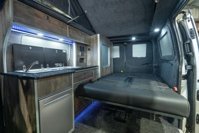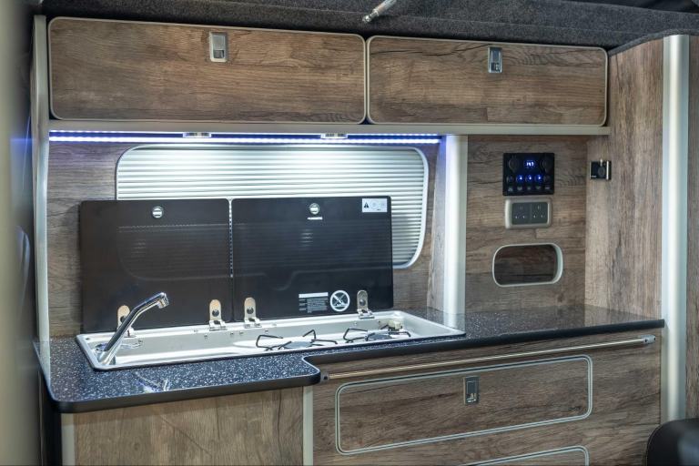 This fantastic campervan is based on a Short Wheel Base version of the Ford Transit Custom and and is the ideal camper to get started on your vanlife journey. Built to the highest standards, the conversion is finished in Santa Fe Grey Oak Lightweight furniture board, with Black Sparkle worktop, splashback and matching tables. Externally, the camper is finished in metallic silver with contrasting 18” swamper style gloss black alloy wheels and a uselful awning rail is already fitted above the sliding door, while internally there is a Webasto night heater to keep the chills away. so this camper is ready to get you out on the road in style and comfort!