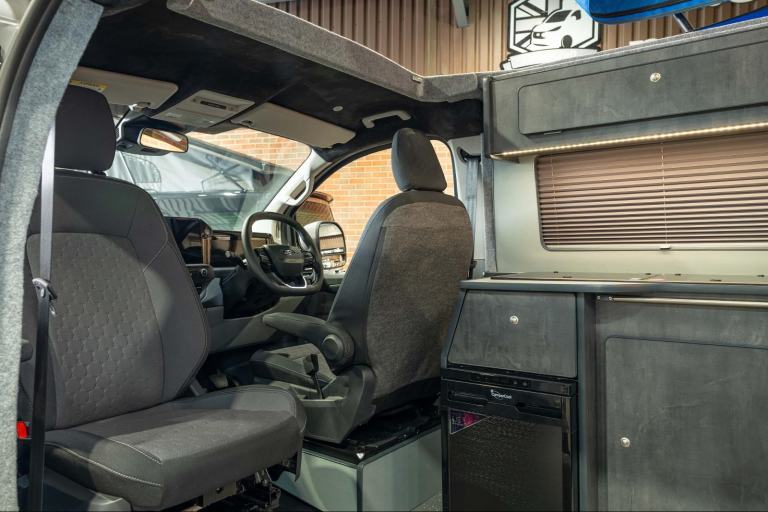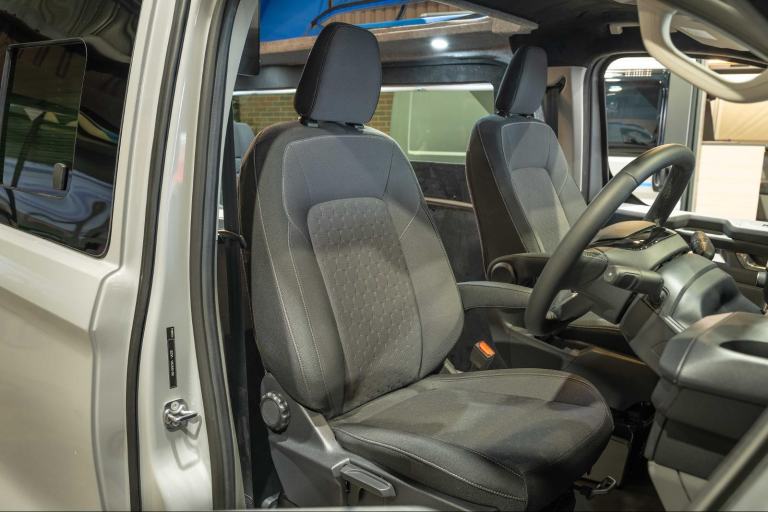 Only 70 delivery miles and taken straight to our workshop for conversion is this stunning 2025 170BHP Ford Transit Custom Limited Campervan finished externally in Ford Grey Matter Paintwork with contrasting blue canvas to the pop-top roof. Professionally converted by our team with Slate Grey lightweight cabinetry and Monument Grey Woodgrain worktop, splashback and matching tables. The front single passenger seat is fitted to a swivel base to create a cosy lounge area and the versatile RIB bed has been upholstered to match the original Ford Pin Hex pattern fabric on the front seats to keep the OE look.