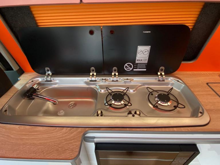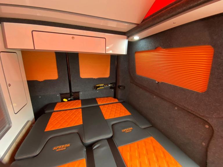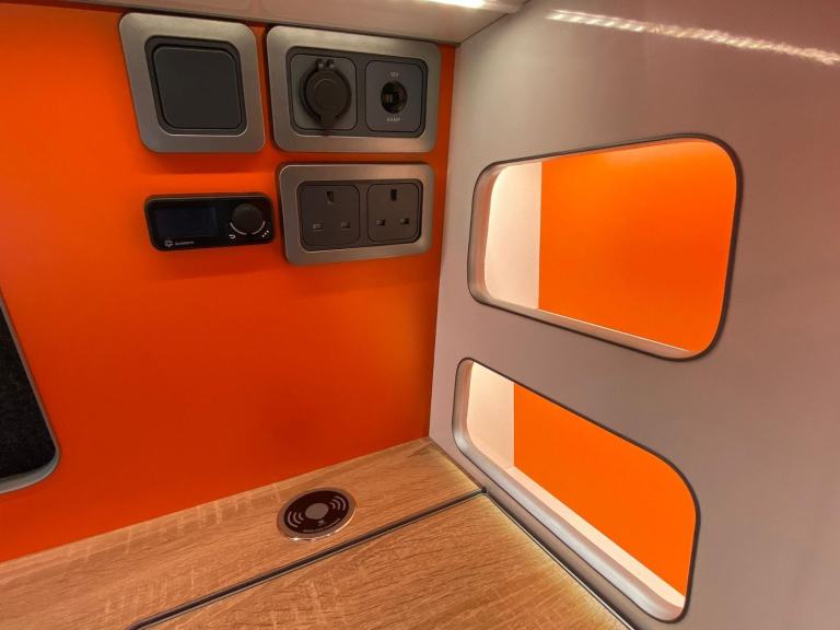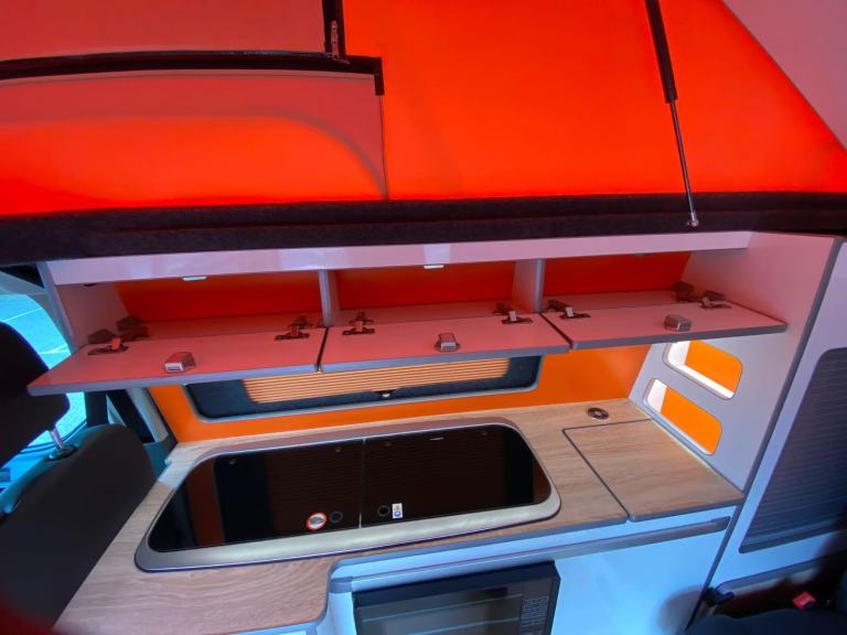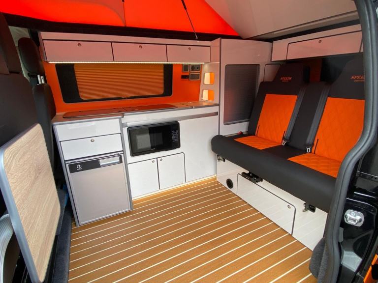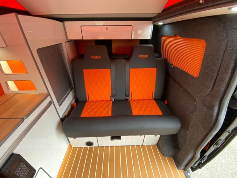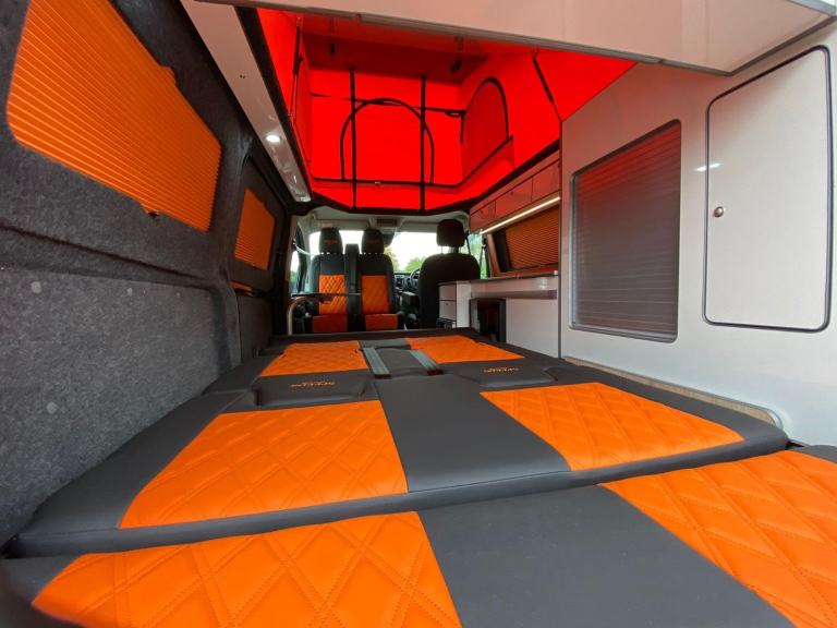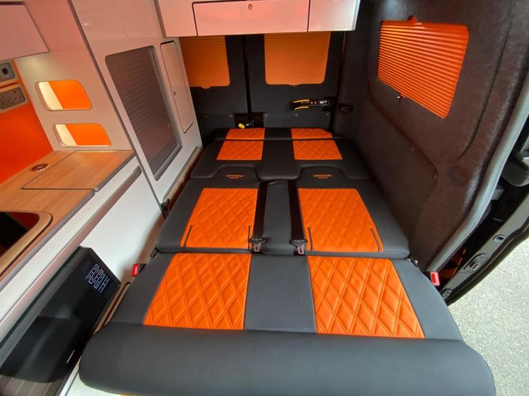 A high-spec, professionally built Adventurer Edition campervan finished in Panther Black, featuring a full duo-tone Beluga Black & Orange diamond-stitched Alcantara leather interior. Stylish, fully equipped, and ready for adventure.