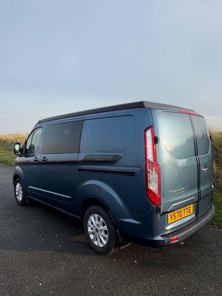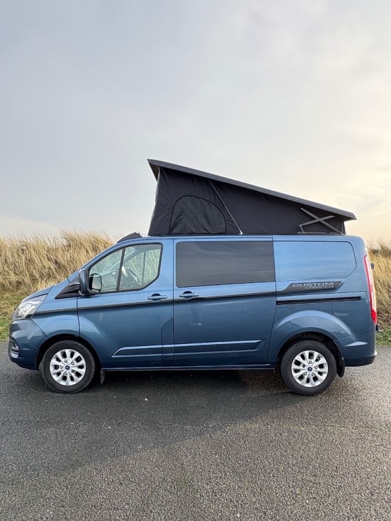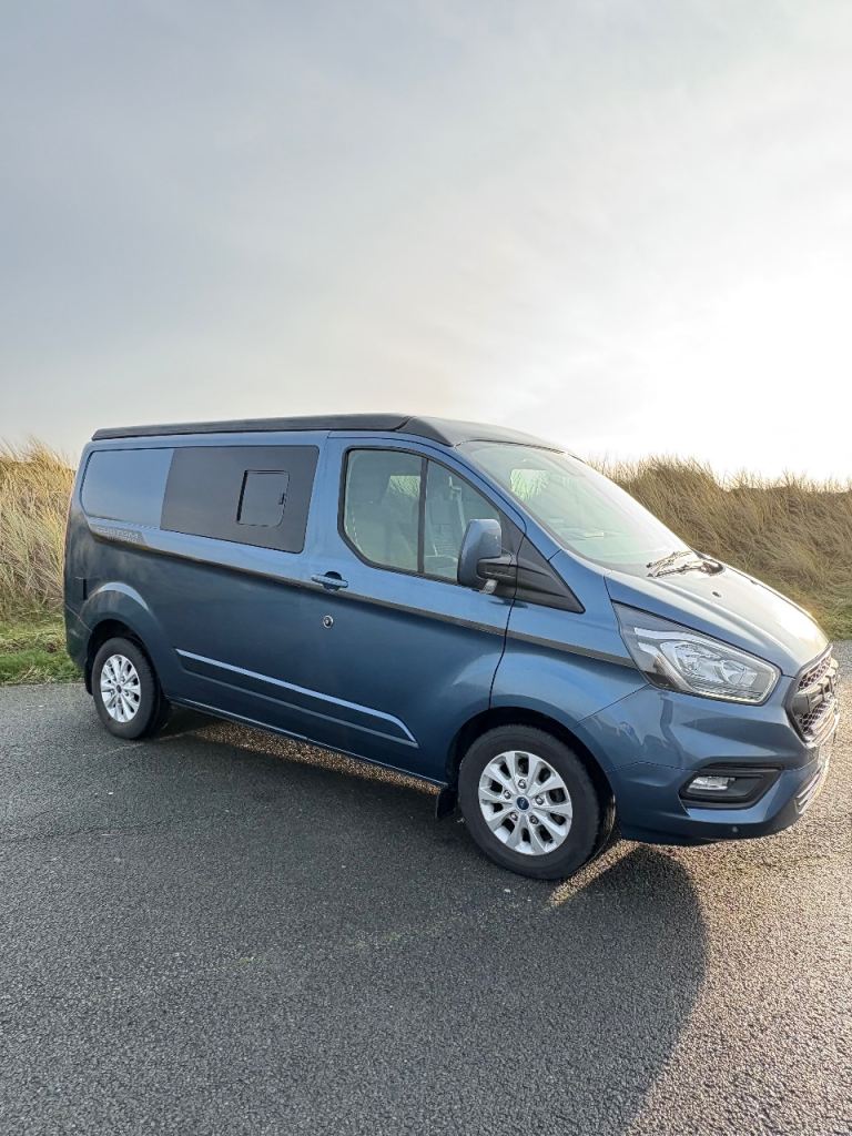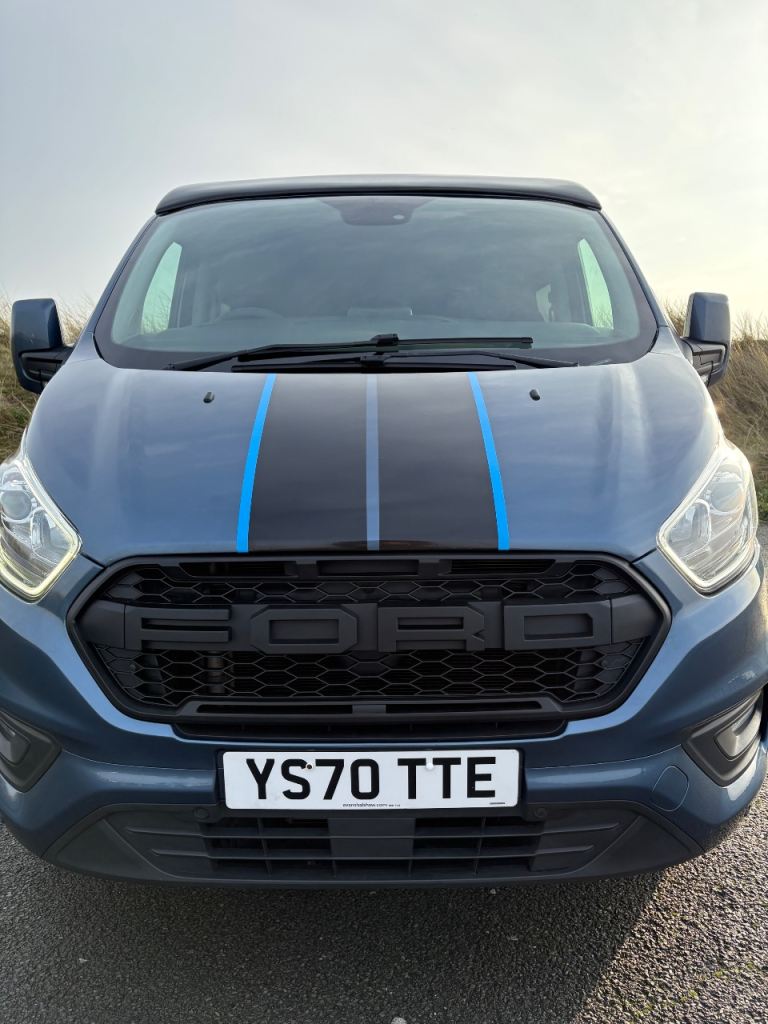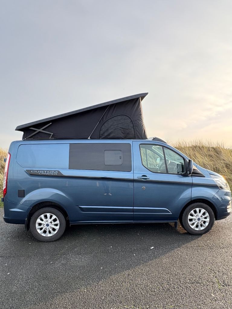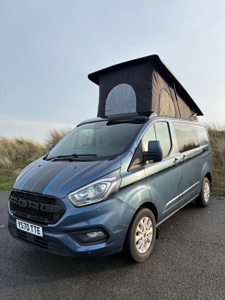 Brand New Ford Transit Custom Limited Camper Van. 68,000 miles. NEW WET BELT / WATER PUMP & SERVICE. Fully insulated, sound deadened and carpeted in Anthracite Grey. Professionally fitted pop‑top roof with upper sleeping area. Full standing height when the roof is raised. MOT‑compliant rock & roll bed with integrated seatbelts. Travel safely with up to 5 passengers. Front double swivel seat creating a spacious lounge area. Dometic Smev 9222 sink & twin‑hob combination, Fresh and waste water carriers, 50L LG fridge with freezer compartment, Removable table, Built‑in wardrobe storage. 12V leisure system allowing the van to operate independently without hook‑up, 240V hook‑up for campsite use, 4 plug sockets + multiple USB charging points, Victron DC‑to‑DC charger with Bluetooth monitoring — charges the leisure battery while driving,Full gas bottle, Smoke & Carbon Monoxide detectors, 6 LED lights, clear MOT, main dealer service history, 2 keys