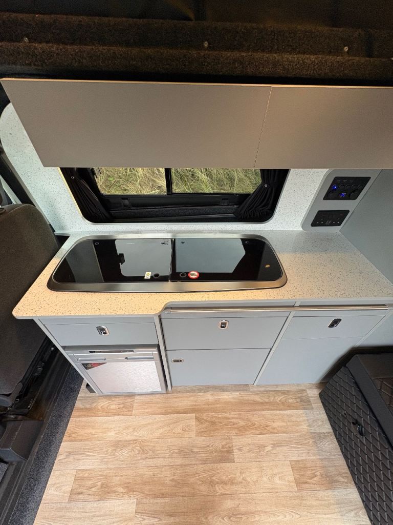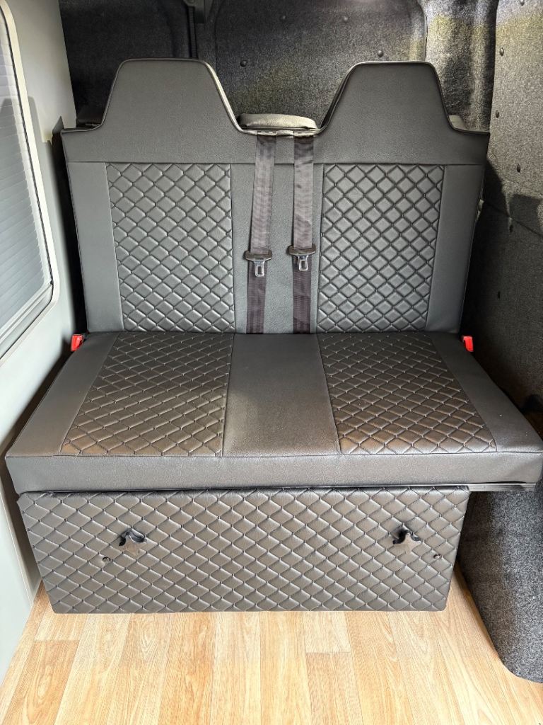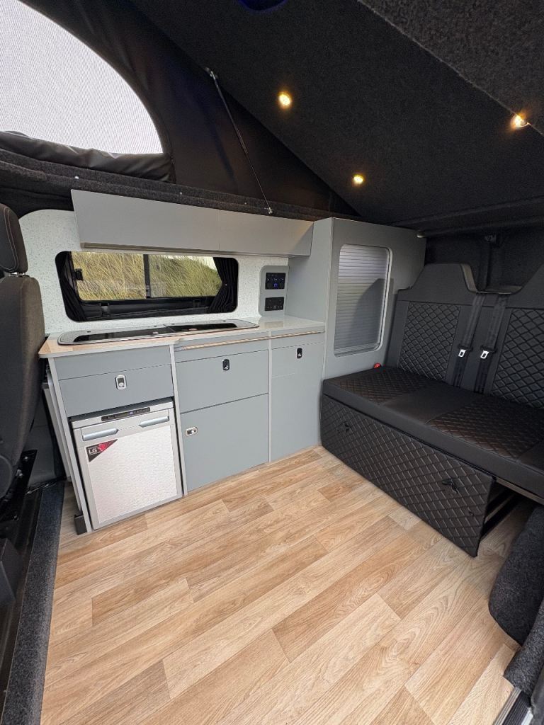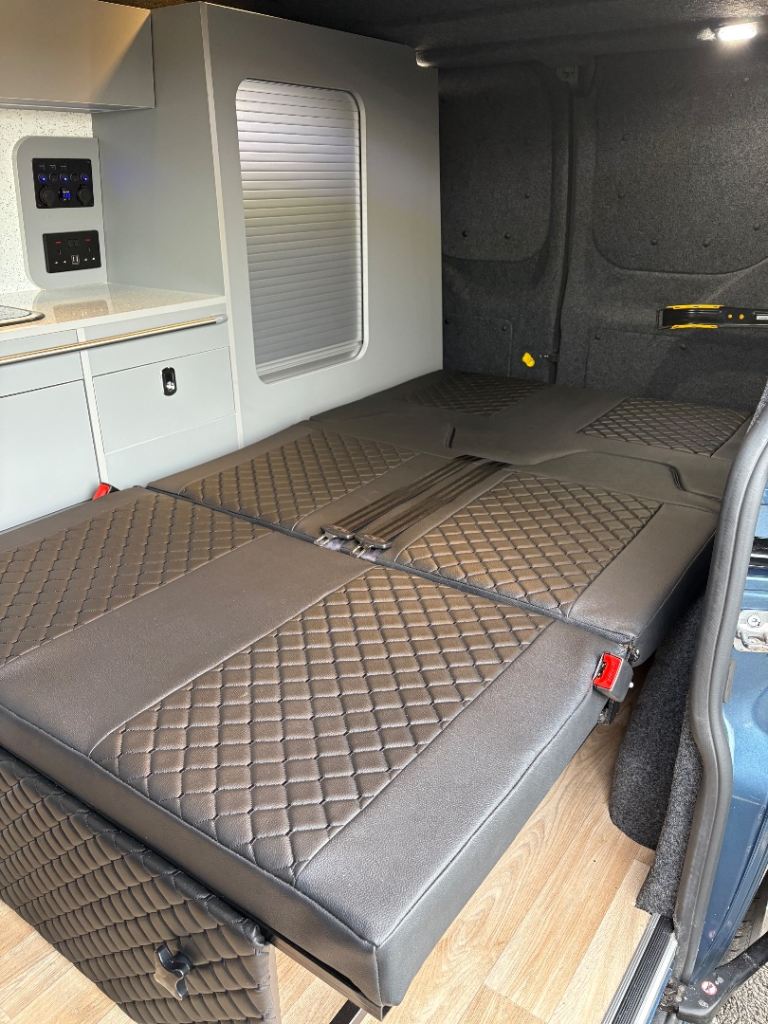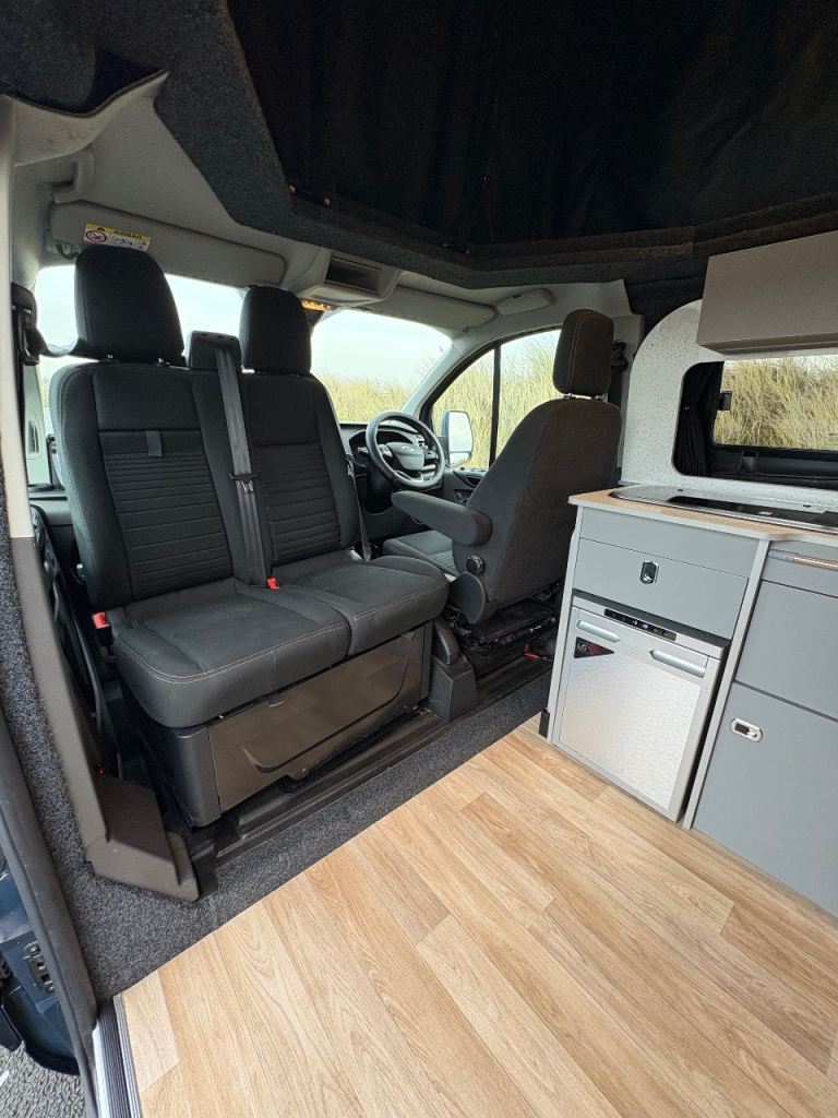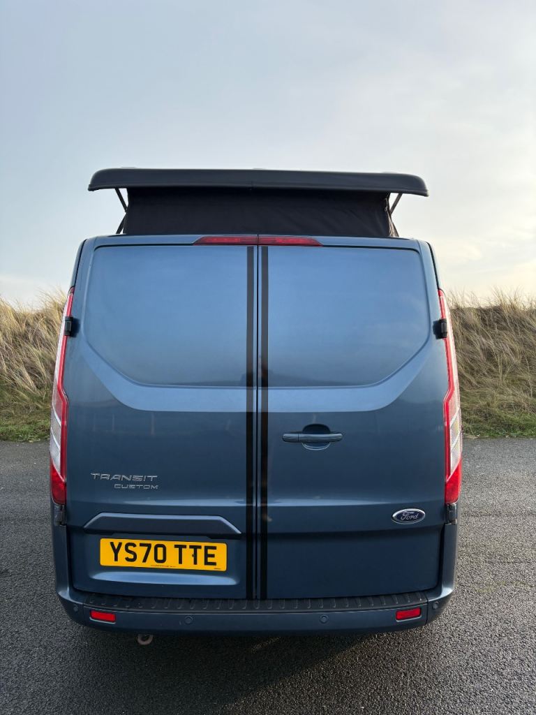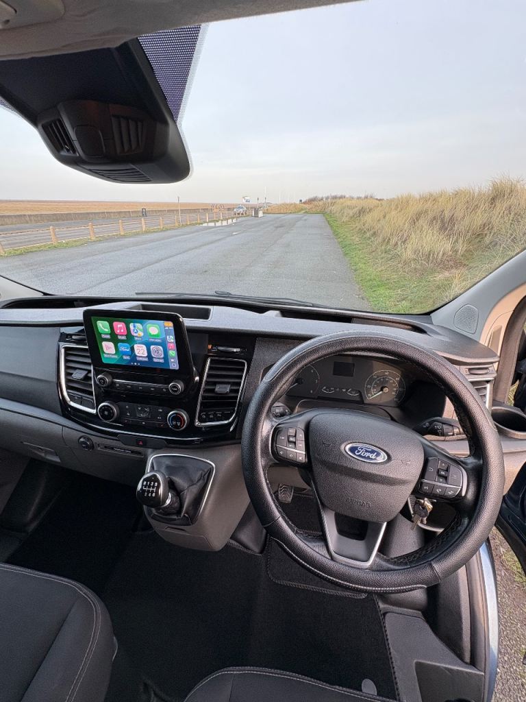 Brand New Ford Transit Custom Limited Camper Van. 68,000 miles. NEW WET BELT / WATER PUMP & SERVICE. Fully insulated, sound deadened and carpeted in Anthracite Grey. Professionally fitted pop‑top roof with upper sleeping area. Full standing height when the roof is raised. MOT‑compliant rock & roll bed with integrated seatbelts. Travel safely with up to 5 passengers. Front double swivel seat creating a spacious lounge area. Dometic Smev 9222 sink & twin‑hob combination, Fresh and waste water carriers, 50L LG fridge with freezer compartment, Removable table, Built‑in wardrobe storage. 12V leisure system allowing the van to operate independently without hook‑up, 240V hook‑up for campsite use, 4 plug sockets + multiple USB charging points, Victron DC‑to‑DC charger with Bluetooth monitoring — charges the leisure battery while driving,Full gas bottle, Smoke & Carbon Monoxide detectors, 6 LED lights, clear MOT, main dealer service history, 2 keys