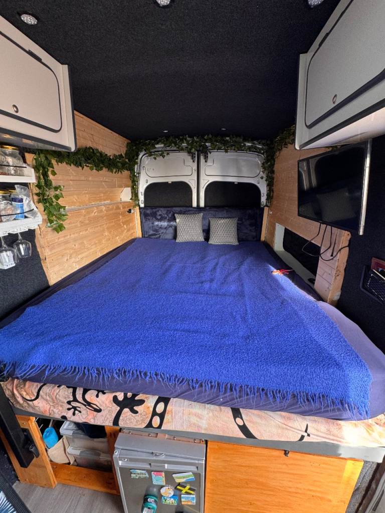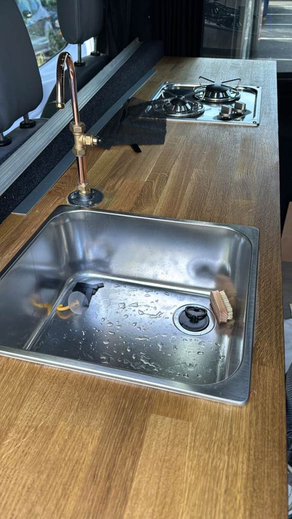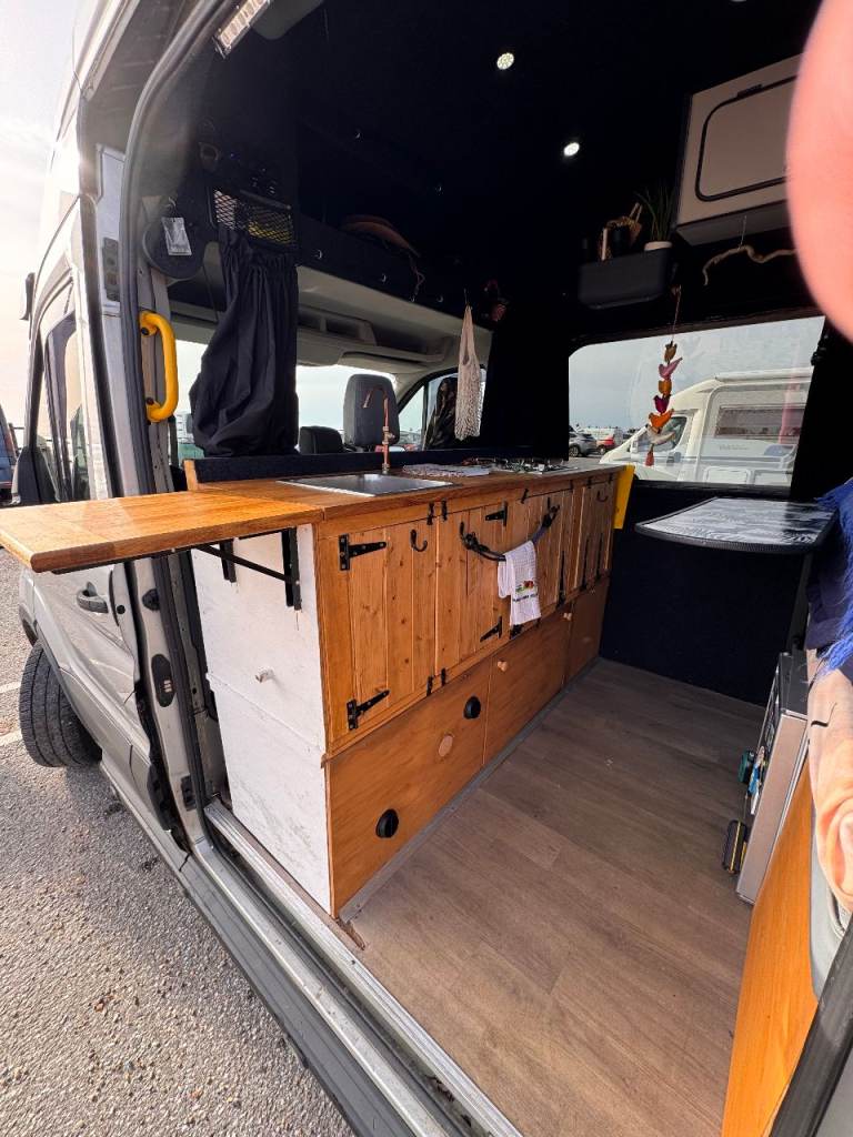 I bought it with white shiny units and twin transverse bunks. Most were removed and a versatile bed and bench along with a worktop with extending flap, was added. Also 12v water supply to a s/s sink with fresh and grey water storage.